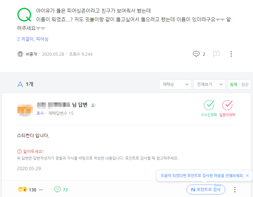 지식인에도 스티컨디존이 어디 피어싱존인지 궁금해하는 질문이 올라오고...