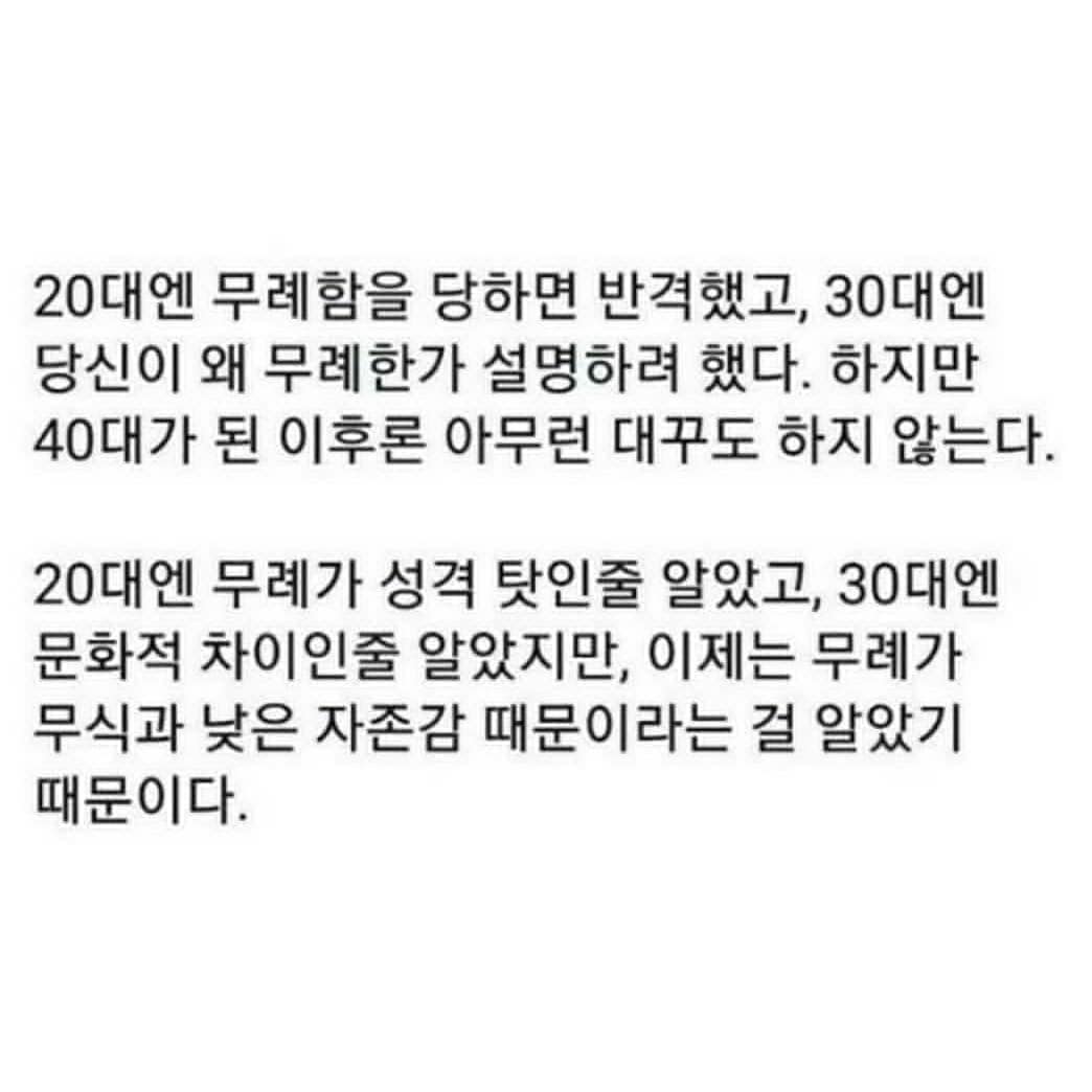 아래는 SNS에서 보고 너무 인상깊에서 트윗에 저장해두었던 짤인데요, 진짜 나이먹으면서 나에게 무례한 사람들에게 아무런 대꾸도 하지 않게된 이유를 알게되었다는 내용입니다. 나를 사랑해주지 않는 사람에게 식어가는 과정이 이런게 아닐까 해서 어떤 의미의 첫 썰의 연장선 같은 감정이라 함께 걸어둡니다.