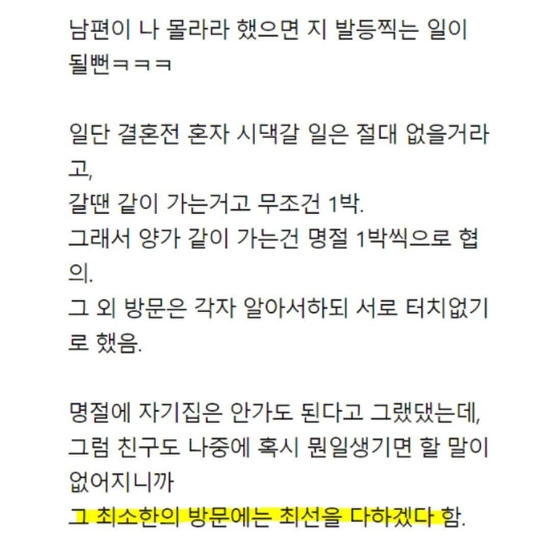 굉장히 인상적인 답변이었습니다. 이 답변과 썰이 묘하게 맞물리는데요, 무조건 아내를 편들고 어머니에게 반기를 들라는 의미가 아니라는 것 쯤은 다 아실 겁니다. 평화로운 중재자로서 남편의 행동이 고부갈등을 없앨 수 있는 핵심 역할이 될 수 있다는 것이겠지요.