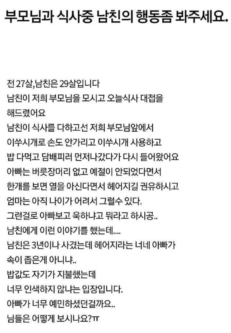 만약 식사 예절을 정말정말 몰랐다고 친다면, 그 얘기를 지적했을 때 아 그럴 수도 있구나, 아버님께서 그렇게 생각하셨구나, 하면서 고친다든가 방법을 생각하든가 해야하는데 장인어른 될 분에게 속 좁다는 식으로 얘기를 해버리.... 할많하않...