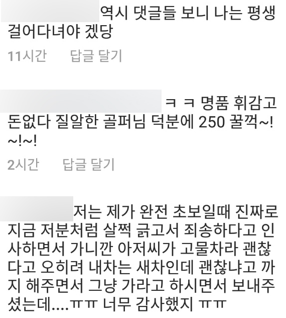 저도 처음에 중고차 낡은거 몰고 다녀서 긁힘 당하거나 해도 먼저 얘기해주시면 괜찮아요~하고 쿨하게 넘어갈 수 있어서 좋았는데, 좋은차 타면 그런 쿨함을 보여줄 수 없어서 ㅋㅋㅋ 이런거 보면 낡은차가 편하기도 ㅋㅋ
