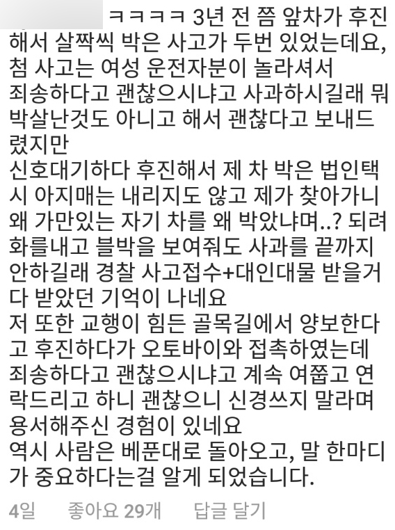 근데 이게 참 사과하면서 시작하면 바로 하대하면서 ㅈㄹ하는 사람들도 있어서 상황과 사람을 잘 파악하는게 중요할거 같네요 아무튼 그래도 서로 사고인데 물어봐주고 미안해하면 누그러지는게 정상이죠... 아... 이런 썰이나 어처구니 없는 블박 장면들 보고나서 운전할 때 마다 스트레스다 ㅎㅎㅎ
