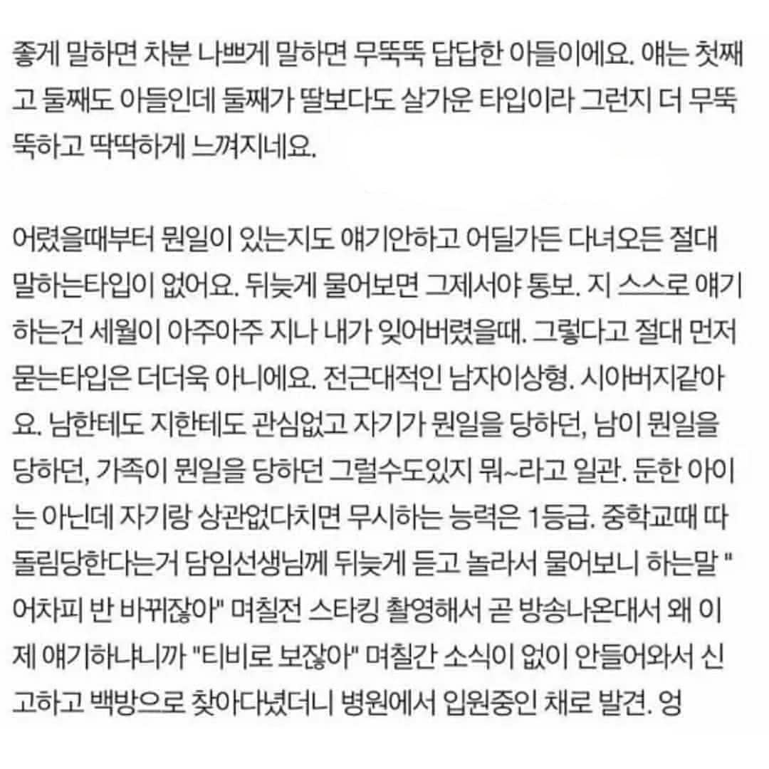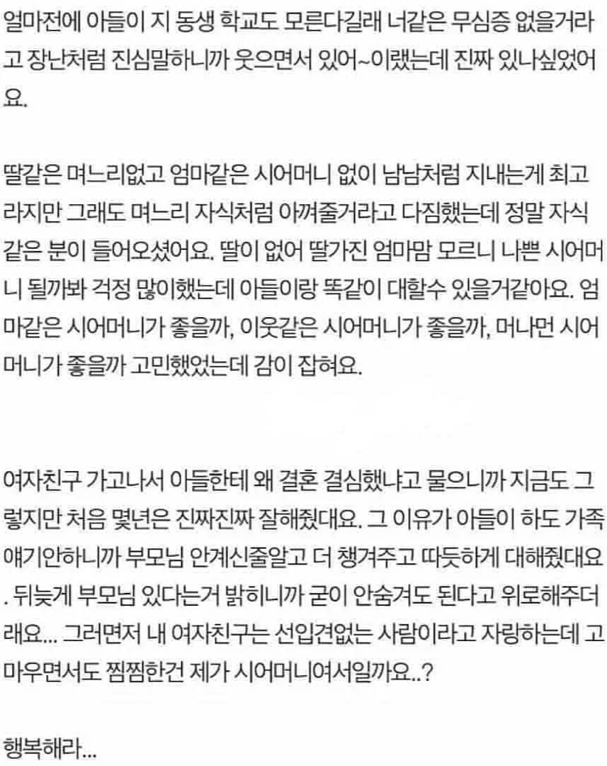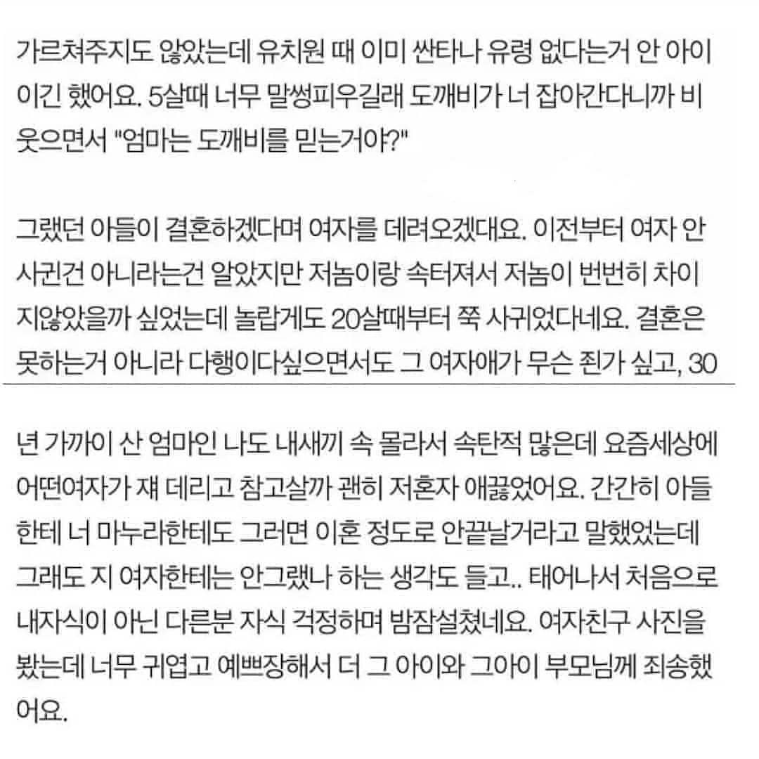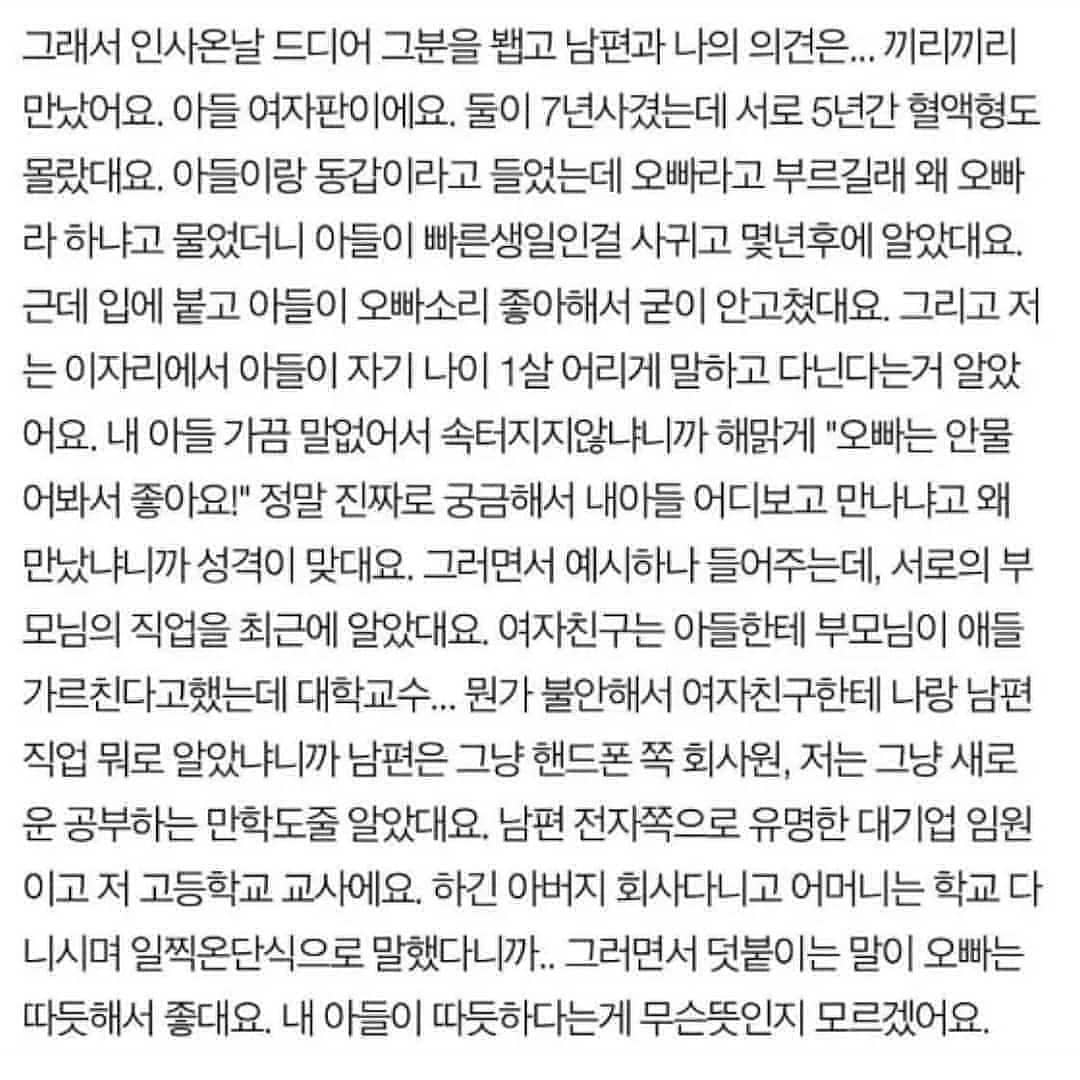 아들이 결혼 상대로 애인을 어머니께 소개드린 모양인데 어머니한테 하던 무뚝뚝한 모습하고 많이 달랐나? 아님 세상엔 그저 다 짝이 있다는 것일 뿐인 것일까 ㅋㅋ 아무튼 요즘은 긴 썰들은 눈이 잘 안 가는데 이건 끝까지 재밌게 읽었어서 포스팅 해둡니다.