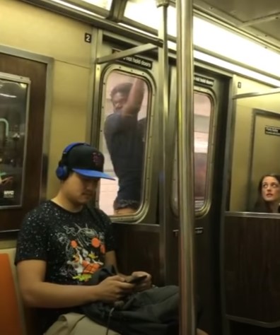 ▼영상. 뉴욕 지하철 밖에서 매달려 가는 사람