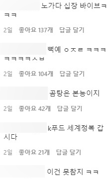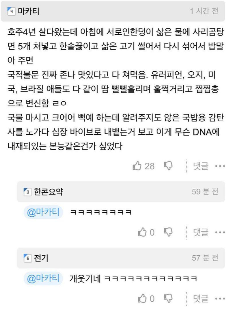 개인적으론 돼지국밥 같은건 안 좋아하는데 곰탕이나 사골같은거, 콩나물국밥 이런건 좋아하는데, 가끔 기력 없을때 설렁탕 엄청 땡기고 그러던데 결국 고기국물 기반은 다들 좋아하나보다. 외국 치킨 스프 같은것도 한국 사람한테 거부감 없는 그런것과 같은 이유일까...
