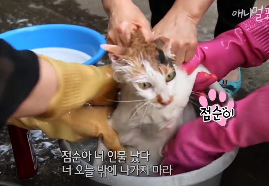 사람들이 아주머니 셋이서 고양이 꽉 잡고 제압하고 있으면서 말 잘듣는다 순하다 하는게 너무 웃기다고 함 ㅋㅋㅋ
