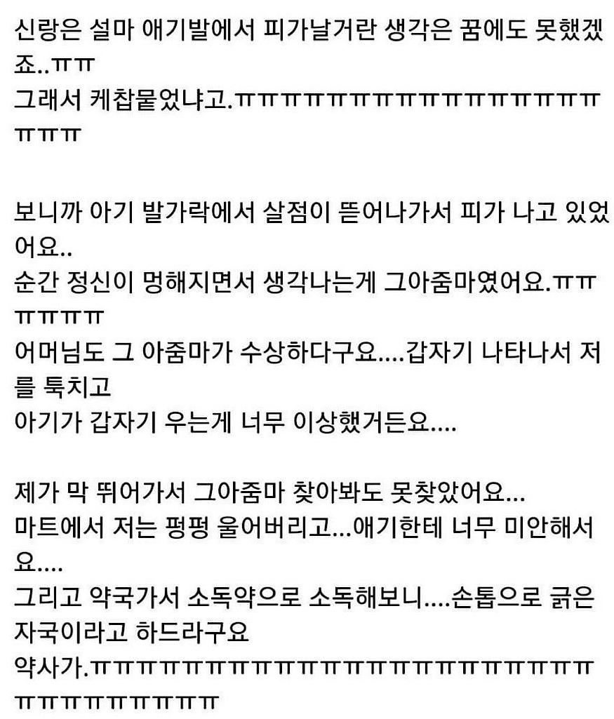 '배틀스타 갤럭티카'라는 유명한 드라마인데, 인간 처럼 생긴 외계인(기억이 가물가물?) 여자가 인간 아기 귀엽다고 구경하다가 그냥 스르르 유유히 사라지는데, 알고 보니 힘 조절을 못해서 연약한 아기를 다치게 한 것... 이었던 장면입니다. 아래 영상 첨부하니 한 번 보세요. ㅠㅠ 뭐 위의 썰과는 연관 없는 드라마 장면이지만, 낯선 사람한테 아이 보여주다가 봉변 당하는 것은 같은 맥락 같아서 생각나서 포스팅 해둡니다. 직접적인 묘사는 없지만 드라마에서는 외계인에 대한 묘사를 하기 위한 필요한 장면이었다고 생각되네요. 혹시나 보기에 따라 불편할 수 있으니 주의해주세요. 낯선이의 관심을 경계하게 되는 요즘입니다.