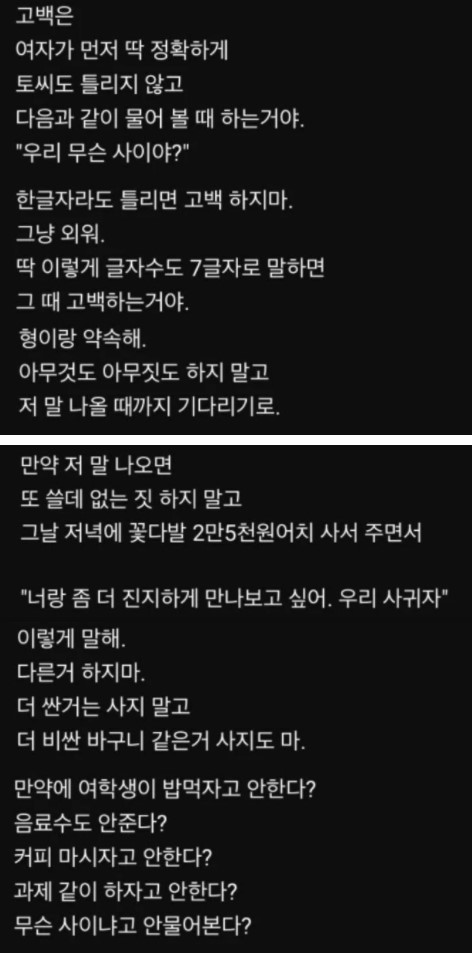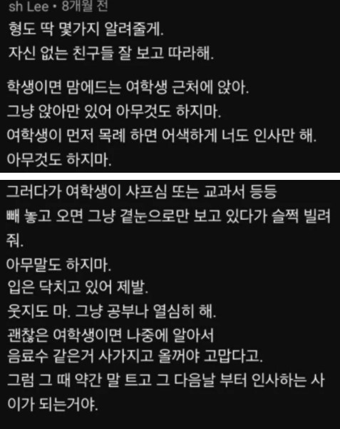 남녀가 바뀌어도 적용될 수 있을것 같은데? ㅋㅋㅋ 주변에서 고백하고 싶어서 안달난 사람들 보면 참으라고 상대는 아직 그런 생각 안 하고 있을거라고 얘기해준 적이 있었는데 이 글을 보니까 정말 그럴것 같네요. 요즘 시대에 딱 맞는 방법이 아닐까 싶습니다. 이제는 막무가내로 고백하면 좀 무서운 시대가 된것 같아요. 옛날에도 서로 마음이 안 맞는 일방적 방법은 고통 아니었을까...