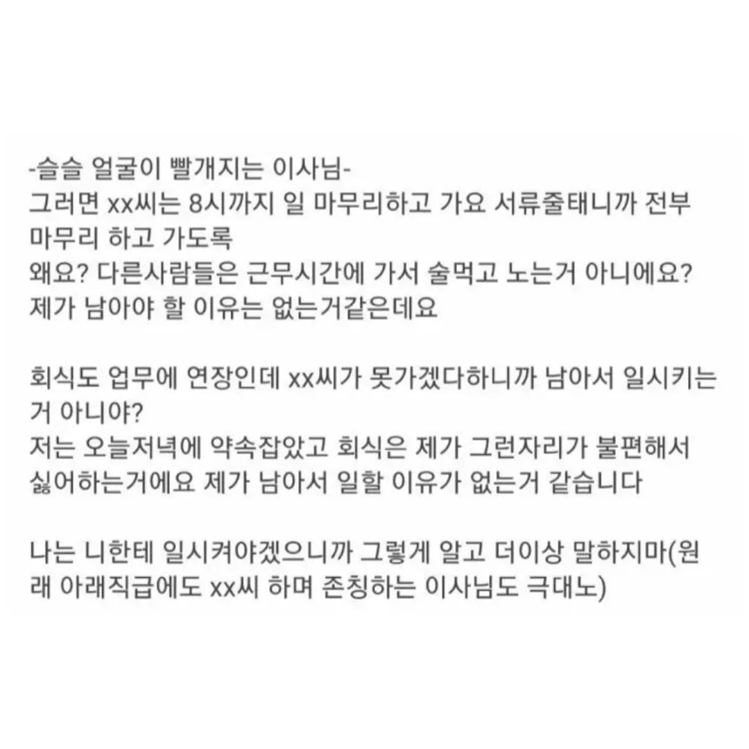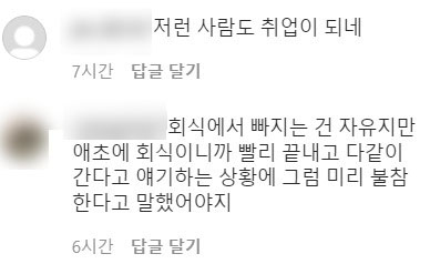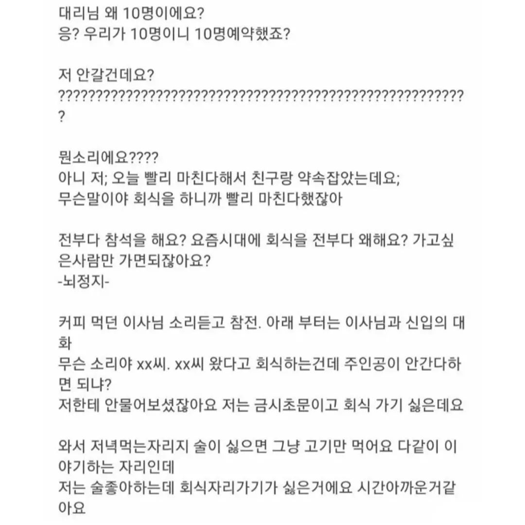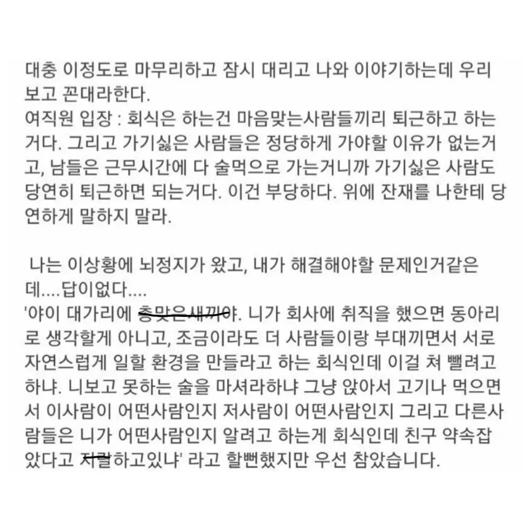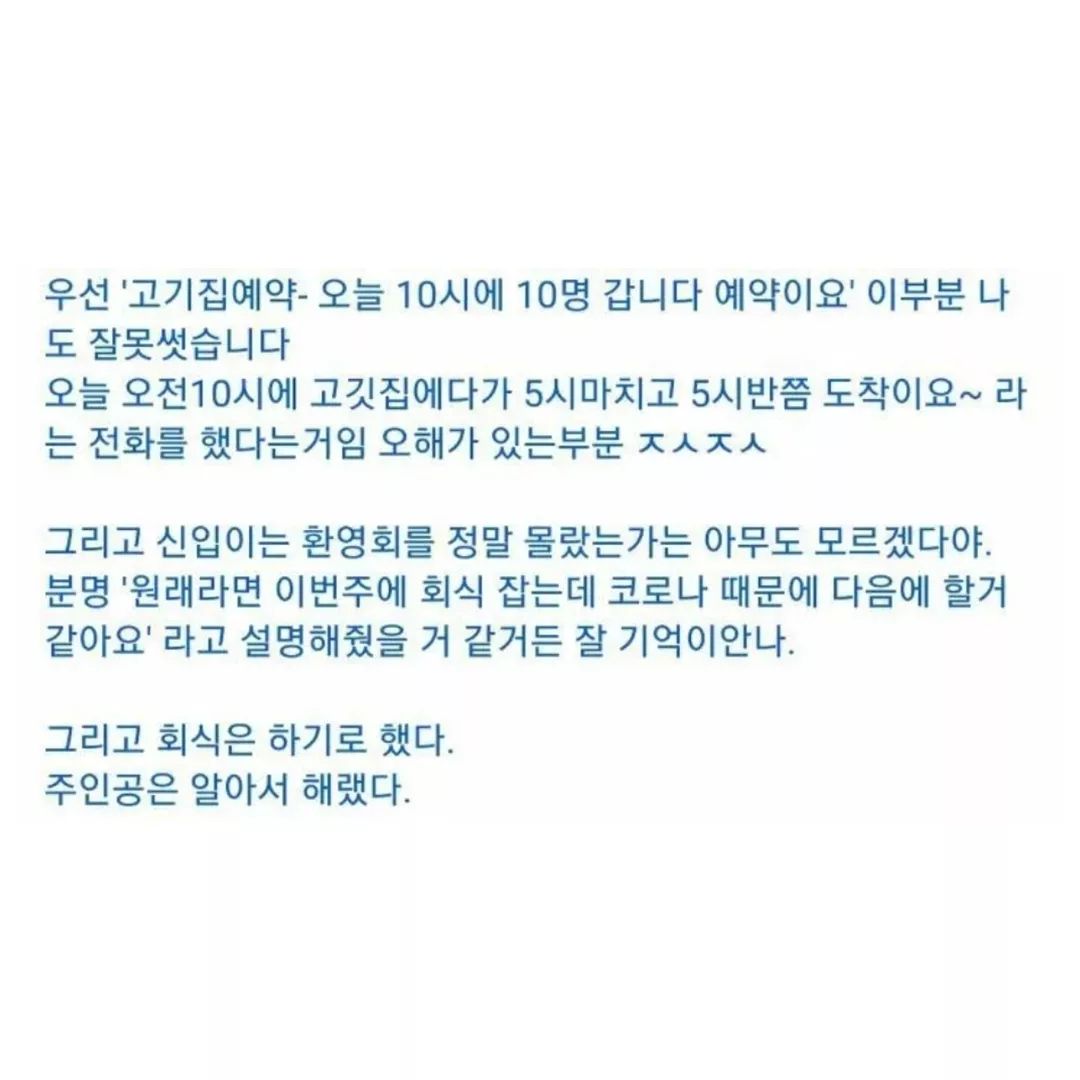 아래 직원한테도 존댓말 해주던 이사님 빡치게 한 것도 능력이라면 능력인가 이것만 인정한다 진짜 화가 나네요 ㅋㅋㅋㅋ 근데 진짜 요즘 뭔가 사회적으로 잘 섞이지 못하는 날카로운 사람들 많은거 같아요. 그냥 좋게 좋게 이야기 하면서 서로 하면 되는데 날 세우면서 자기 생각 절대 안 굽히고... 근데 진짜 저럴거면 회사 왜 간거지... 그냥 혼자 일하는 일을 찾으면 좋을텐데... 회식이 아무리 싫어도 고기만 먹고 가라고까지 얘기하고, 신입 사원을 위한 이벤트이고, 서로 알아가고 아이스 브레이킹 하자는 취지인데 너무 아쉽게 보이네용... 나도 술은 안 먹지만 다같이 밥먹는건 좋아서 회식 좋아하는데... 야로나 빨리 사라져라 ㅠㅠ