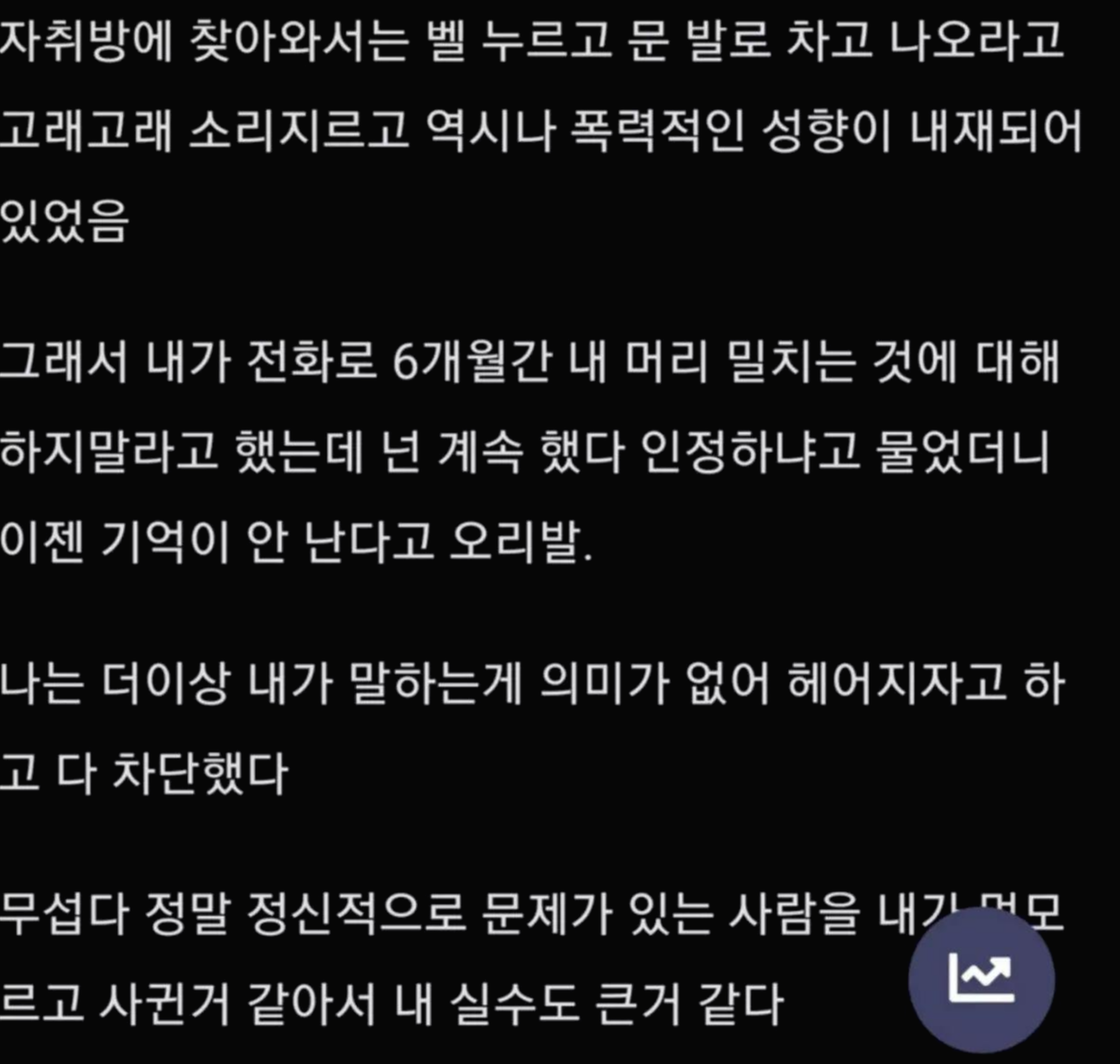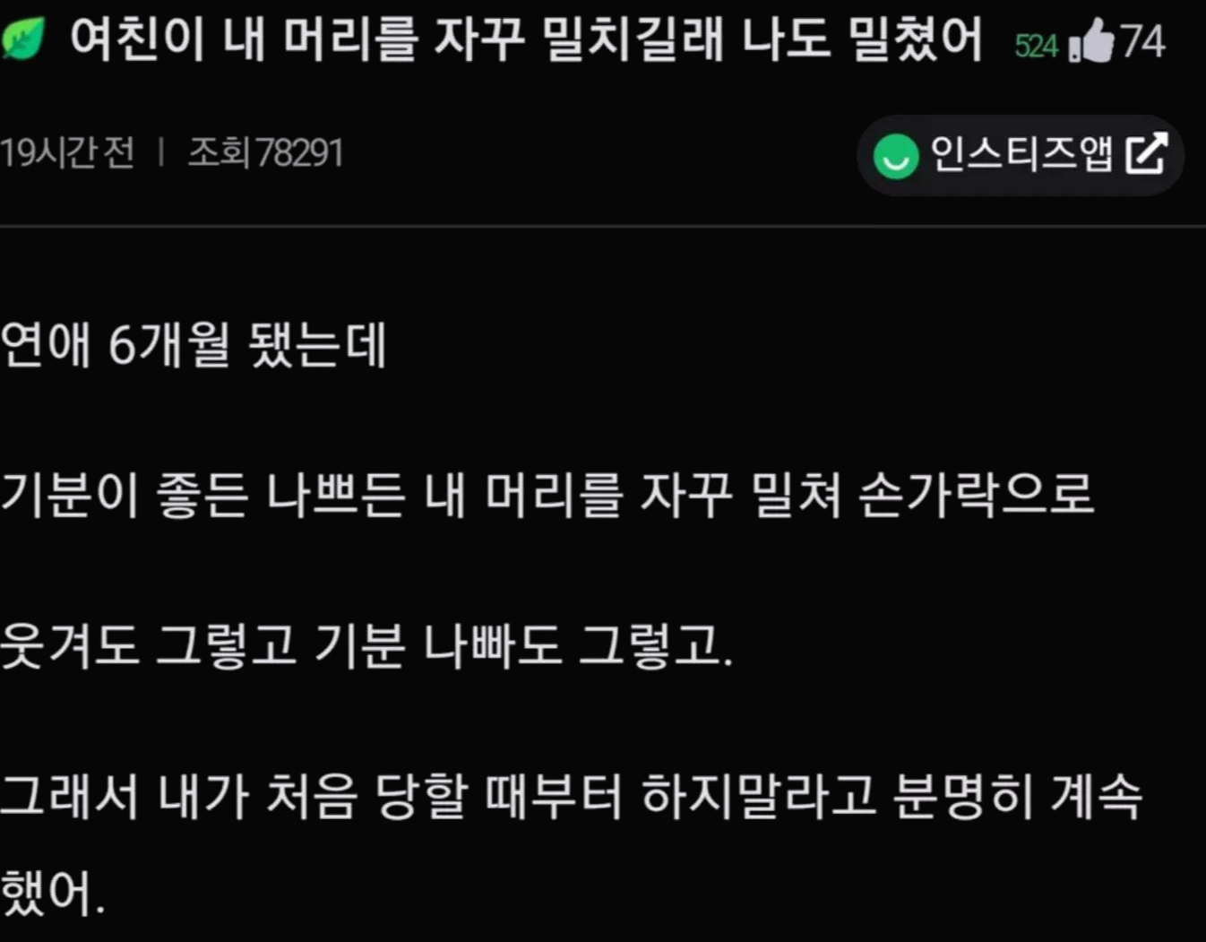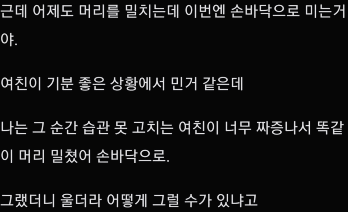 당사자에겐 심각한 문제일텐데 아무튼 좀 이상하네요... 잘 안 맞는 부분이 있었을텐데 6개월 간 이어져서 스트레스 많으셨을 듯... 머리를 사랑스럽게 만져도 좋을까 말까인데 손가락으로 그러는 건 정말 가까운 사이라고 하더라도 예의 없는 것이 아닐까요?