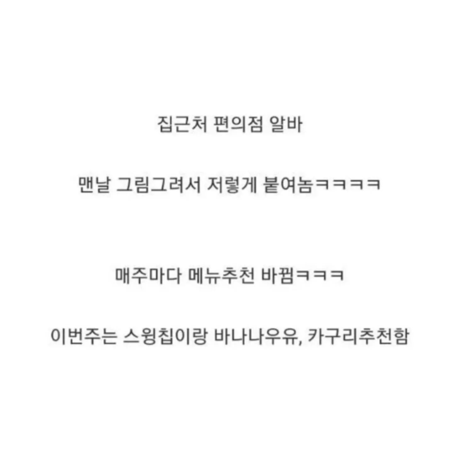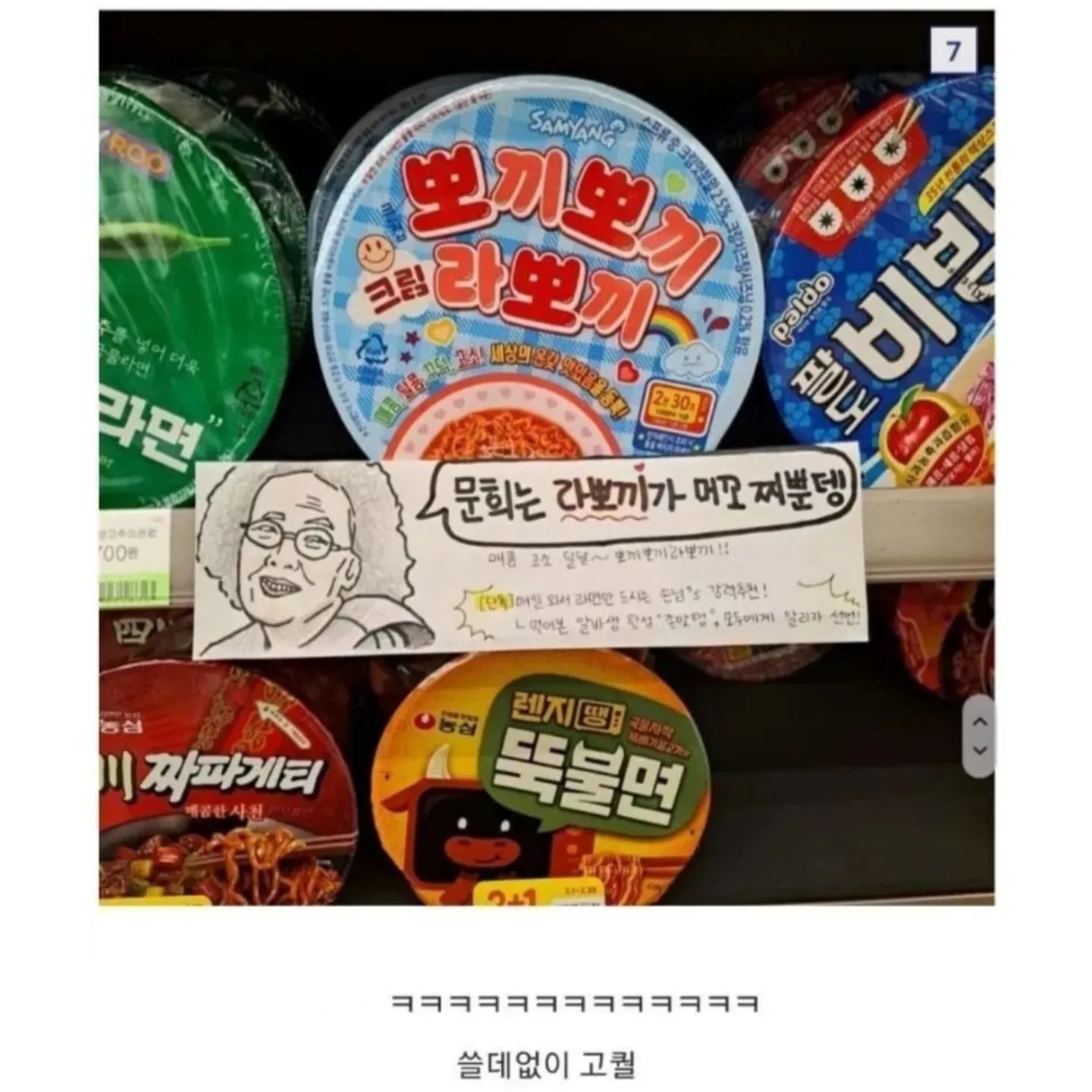 사람들이 100을 시키면 150을 하는 게 이런거냐면서, 월급 더 줘야되지 않나, 점장급이다 칭찬이 자자하네요. 직접 먹어본 메뉴만 추천해주신다는데 진짜 궁금하네요. 편의점에 새로운 메뉴 나와도 왠지 기존에 먹던 것만 계속 고르게 되더라고요. 마지막에 추천해준 신라면+짜파게티(신볶게티) 궁금해서 한 번 해볼까 싶어집니다. 짜파구리는 종종 먹었었는데 신라면이라... 좀 더 시원한 매운맛일까요? 짜파구리는 아무래도 해물맛이 나서 많이 짰었는데 어떠려나 ㅋㅋㅋ 그림 실력도 좋으신거 같고 밈 활용을 잘 하시는거 같아서 눈길이 확 사로잡히네용 ^^