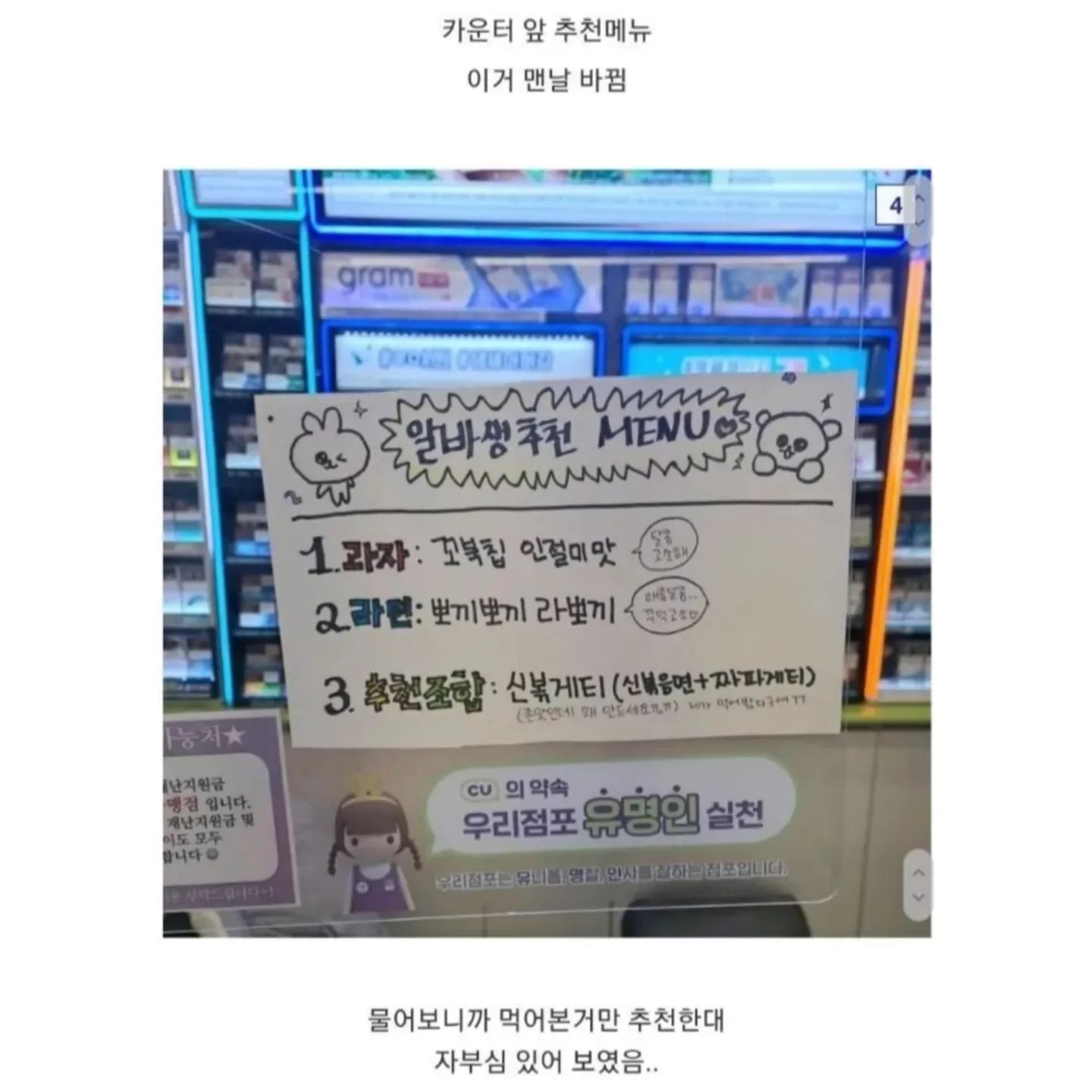 사람들이 100을 시키면 150을 하는 게 이런거냐면서, 월급 더 줘야되지 않나, 점장급이다 칭찬이 자자하네요. 직접 먹어본 메뉴만 추천해주신다는데 진짜 궁금하네요. 편의점에 새로운 메뉴 나와도 왠지 기존에 먹던 것만 계속 고르게 되더라고요. 마지막에 추천해준 신라면+짜파게티(신볶게티) 궁금해서 한 번 해볼까 싶어집니다. 짜파구리는 종종 먹었었는데 신라면이라... 좀 더 시원한 매운맛일까요? 짜파구리는 아무래도 해물맛이 나서 많이 짰었는데 어떠려나 ㅋㅋㅋ 그림 실력도 좋으신거 같고 밈 활용을 잘 하시는거 같아서 눈길이 확 사로잡히네용 ^^