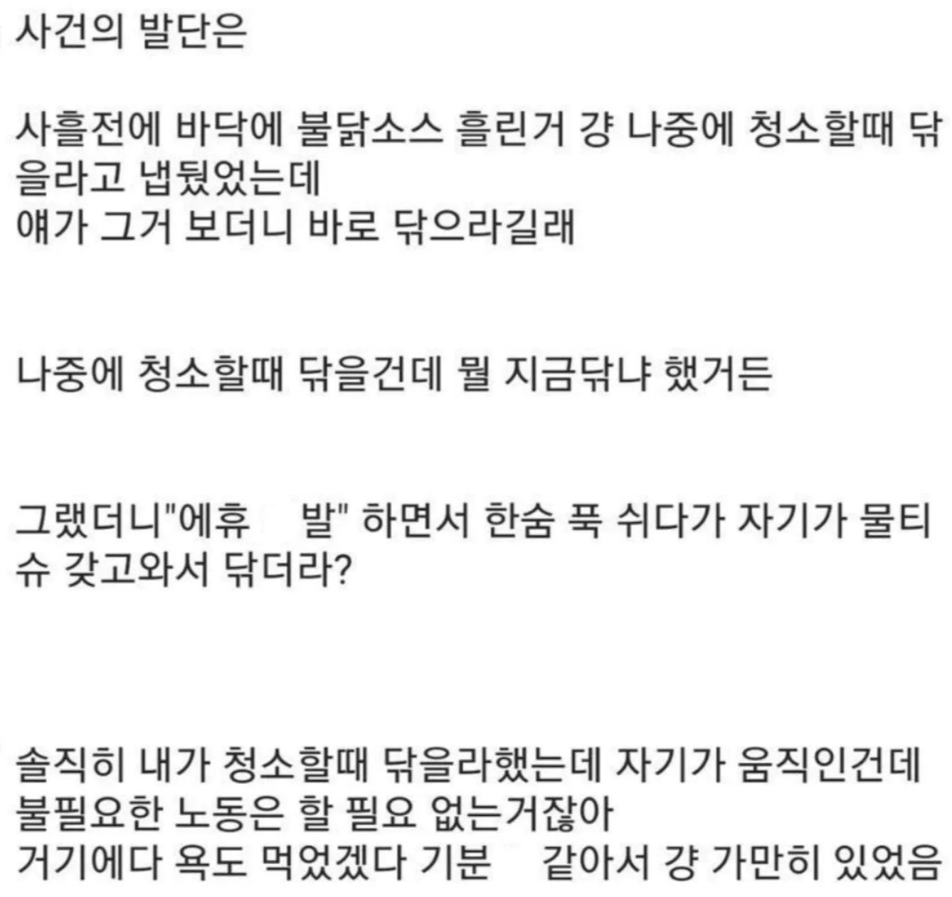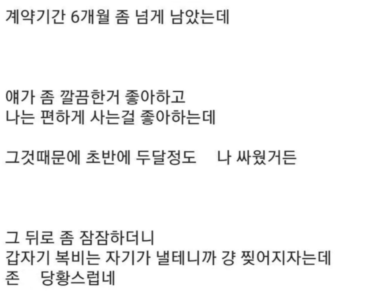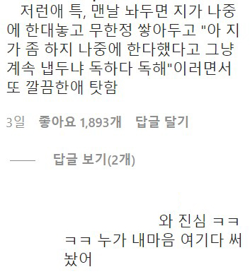 와... 이 정도로 자기 스스로에게 관대하고 남 탓만 하는 사람이 있... 네요... 주작인가 싶기도 하면서 음... 실제로 있을거 같기도 하고... 아무튼 이게 만약 실제라면... 룸메분 진짜 고생하셨겠다... 글 말미에 '결벽증 있는 ㅅ끼 만났다가 괜히 이사가게 생겼다'는 거 읽으면서... 와, 진짜 어떤 의미로 감탄을 하게 됩니다...ㅎㅎㅎ;;; 같이 살면 이런 저런 부분들을 서로 맞춰주고 배려해야 된다고 생각하는데요, 특히 가까운 친구나 직장 동료 등 좋은 관계를 오래 유지하고 싶다면 오히려 더 낯선 사람에게 보다 더 배려해야 된다고 생각합니다. 소중한 관계를 계속 유지하려면 그것이 그냥 내 멋대로 한다고 상대가 모두 받아주는 그런 건 아니니까요. 절대적인 사랑의 부모 자식 관계도 예의가 필요한데, 저건 좀 너무 한 듯...