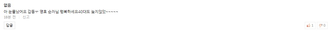 마지막에 나온 순자&영호 님의 모습을 보면서 그 사이에 인연을 만나서 더 예뻐지고 멋져지신 듯한 그런 인상을 받았어요 정말 연애를 하면 저렇게 다 예뻐지나봐요 ㅋㅋ 너무너무 응원드립니다 :)