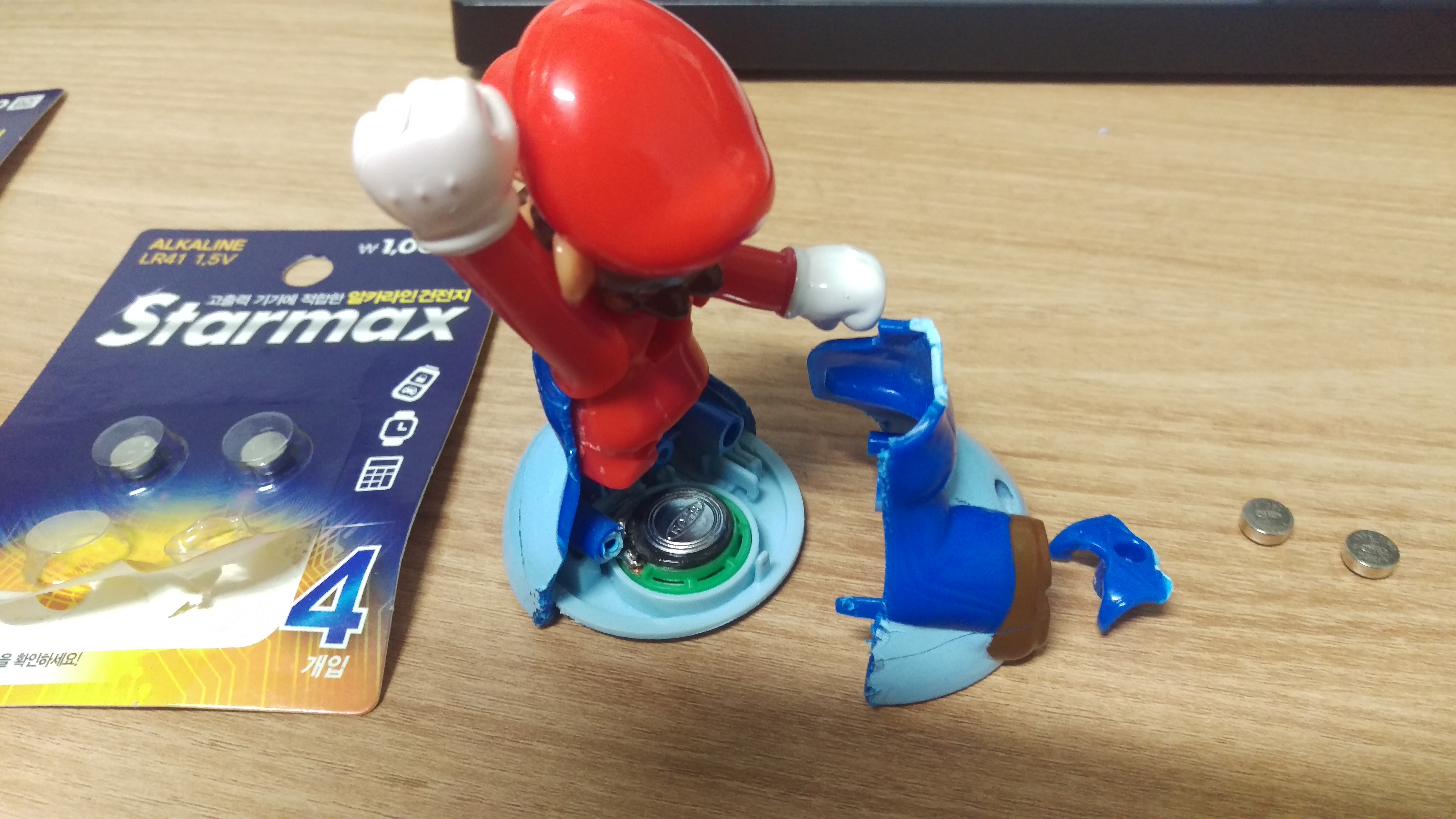 아래는 건전지 교체한 후의 사진인데 아래 보시면 박살난 게 보이시죠? ㅋㅋㅋ