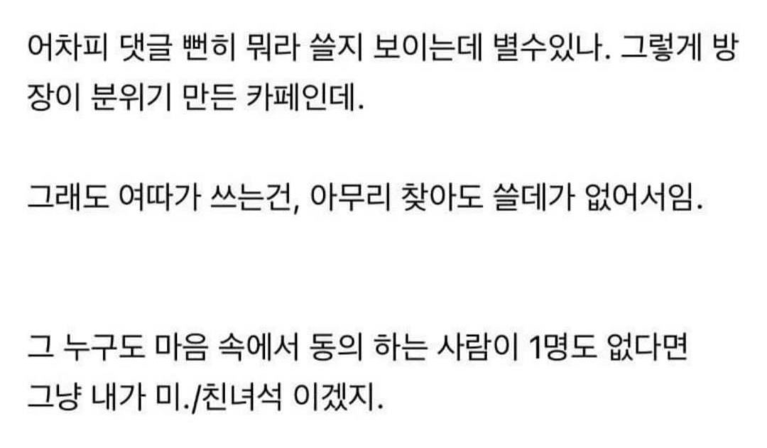 글 보자마자 빵 터지고 왠지 모르게 시원해져서 이런저런 생각이 나서 포스팅 해봅니다. 나도 뭔가 저렇게 시원한 성격이었으면 좋겠다 싶은 그런 생각이 들었다고 해야하나. 남 눈치만 보면서 살아온 것 같은데 빠르게 생각이 정리되고 보편적인 감성을 거스르지 않는 밉지 않은 시원한 언변? 그런 게 있는 사람이 참 대단하다는 생각이 드네요. 그러니까 침착맨 유튜브도 방송도 흥하는 것이겠지만. 아무튼 다들 시원한 여름 되시길.
