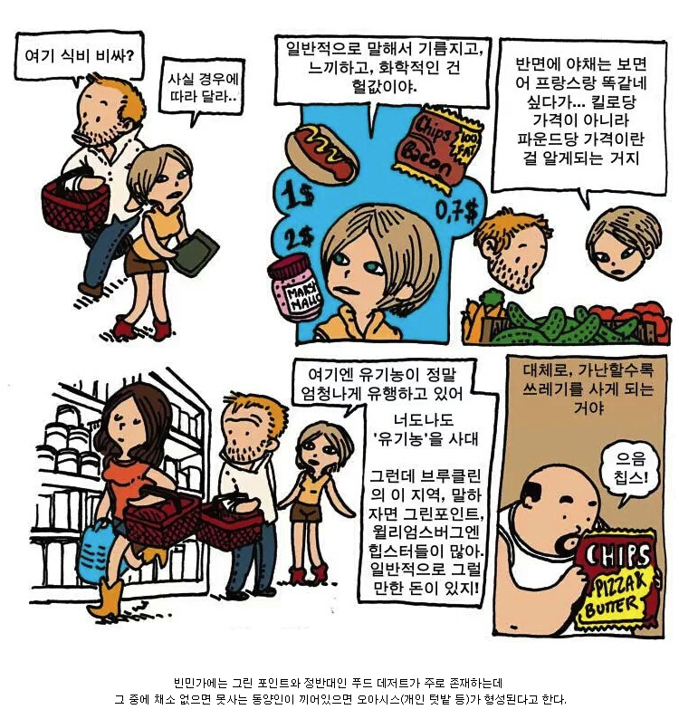 확실히 야채를 많이 먹는 한국인... 김치 없으면 안 되는 문화이고 땅이 좁고 인구가 많아서 연결성이 좋기도 하고... 왠지 한국과 거리가 먼 문제 같지만, 생각해보면 저도 몇 번 이사를 다니면서 야채를 파는 마트와 떨어진 곳에서 살았던 때는 확실히 과일 채소를 적게 먹었던 것 같다는 생각이 듭니다. 만화 속 이야기 처럼 '푸드 데저트(음식사막)'과 반대되는 지점은 '그린 포인트, 푸드 오아시스'라고 한다고 하네요. (만화 설명 중에 채고 없으면 못 사는 동양인이 끼어있으면 오아시스가 형성된다는 말 왤케 웃기짘ㅋㅋㅋ)