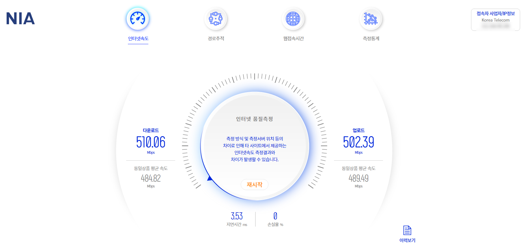 [다운 510.06mbps / 업 502.39mbps / 핑 3.53ms]