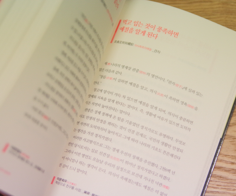 서점에 들렀다가 우연히 사게 된 책입니다. 중국 고전을 365일 동안 한 페이지 씩 읽을 수 있도록 정리되어있습니다. 페이지마다 하단에는 사자성어의 간단한 풀이도 곁들여져 있고요. 내용은 아무래도 고전이다 보니까 조금 가부장적?인 느낌의 교훈도 있긴 한데, 거의 대부분 현대 처세술에 도움이 되는 내용이라든가 자기계발에 도움되는 내용이 많아 상당히 좋습니다. 선물하기도 좋은 책인것 같아요. 예전에 공자의 논어를 따로 사서 보기도 했는데 이런 책이 더 가볍고 다양하게 관심을 가지도록 만드는것으로? 입문용으로? 좋은것 같습니다. 관심이 생기면 관련 서적을 더 찾아서 읽게 될 것 같아요. 참고로 저는 화장실에 이 책을 놓고 하루에 한 페이지씩 읽습니다. (선물하려고 다시 몇 권 더 샀는데, 표지가 좀 밝은? 젊은? 분위기로 바뀌었습니다. 참고하세요.ㅎ)