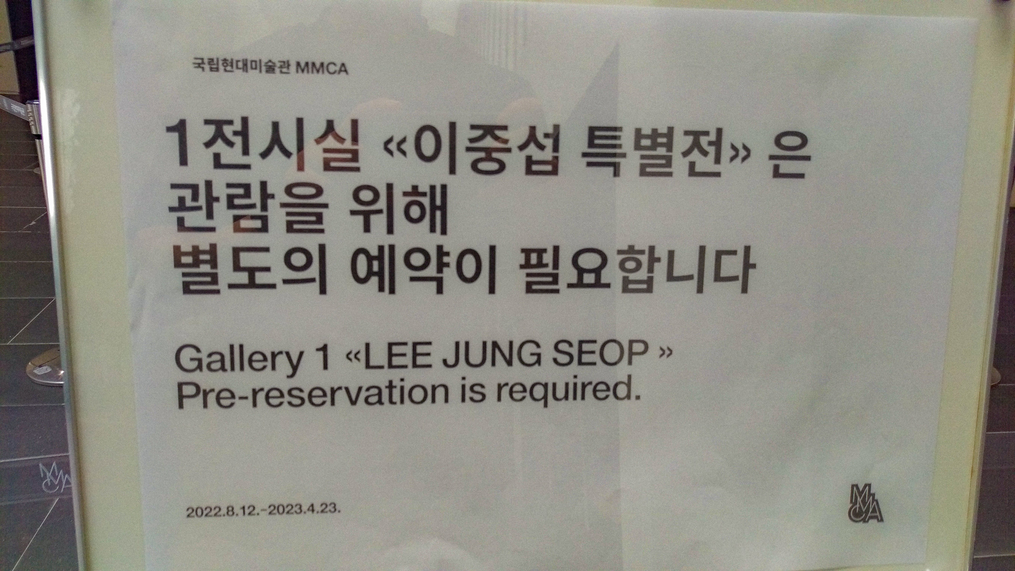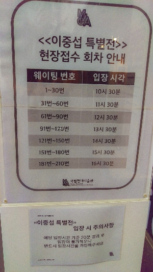 직원 분께 문의드리니 사진에 보이는 옆쪽에서 이중섭 특별전 현장접수를 따로 받고 계셨다. 다행히 내가 도착한 뒤로 약 2시간 정도 후에 여유가 있어서 웨이팅을 걸어두었다. 시간이 다 되면 카톡으로 알림이 오고, 다시 접수처로 와서 티켓을 받아 따로 이중섭 전시 쪽으로 입장하면 된다. 아무튼 다행이었다.