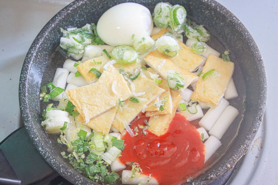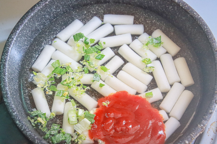 집에 있는 작은 프라이팬에 떡을 꺼내고, 뭉친거 떼어준 다음 살짝 헹궈주고 물을 자작자작... 떡은 귀여운 크기인데 밀떡같이 생겼지만 봉투를 보니 쌀가루 99% 쌀떡. 오히려 좋아. 올리고 기본 소스들을 부어본다. 떡볶이 끓여먹어 보면서 깨달은 것 하나... 물은 정말 자작자작 정도로 적게 넣어줘야 맛있게 된다는 점. 물이 많아지면 졸인다고 더 끓이다가 다 불어터지는 불상사가... 특히 어묵을 넣으면 물 조절이 정말 필수. 생각보다 물은 더 적게 넣기!