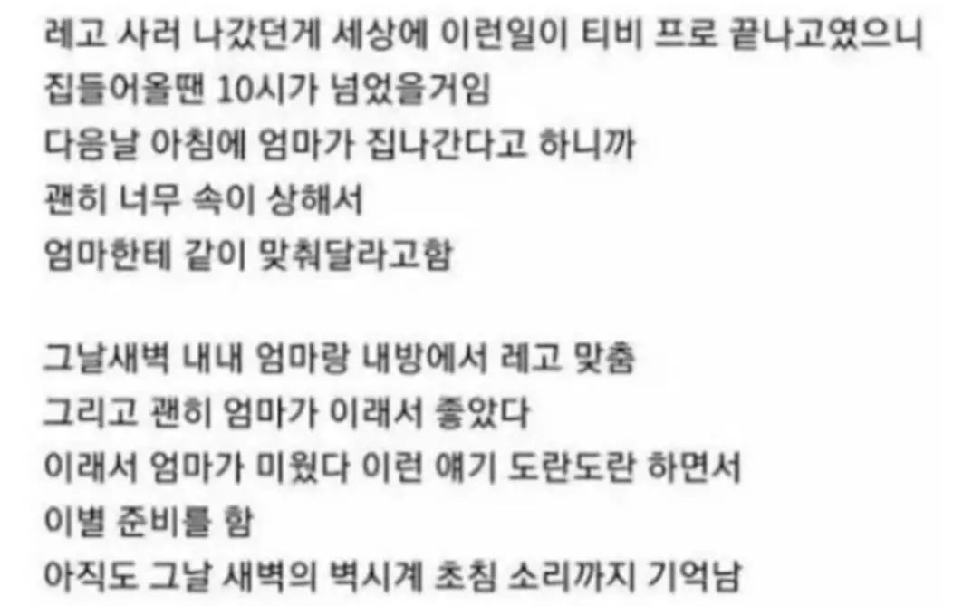 어린 마음에 상황을 이해하고 받아들인 것도 대견하고, 엄마와의 마지막 추억을 저렇게 자세히 기억하고 있다는 사실과 묘사가 마치 영화의 한 장면을 본 것 같아서 괜히 먹먹하네요. SNS 볼때면 모두가 행복한 모습들만 올리는 것 같지만, 실상 마음 한 구석에 아픔 없는 사람은 없는 것 같습니다.