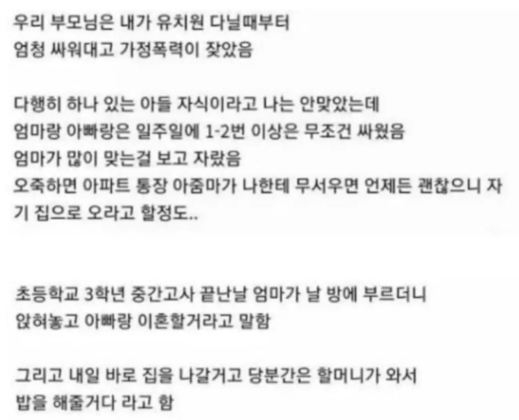 어린 마음에 상황을 이해하고 받아들인 것도 대견하고, 엄마와의 마지막 추억을 저렇게 자세히 기억하고 있다는 사실과 묘사가 마치 영화의 한 장면을 본 것 같아서 괜히 먹먹하네요. SNS 볼때면 모두가 행복한 모습들만 올리는 것 같지만, 실상 마음 한 구석에 아픔 없는 사람은 없는 것 같습니다.