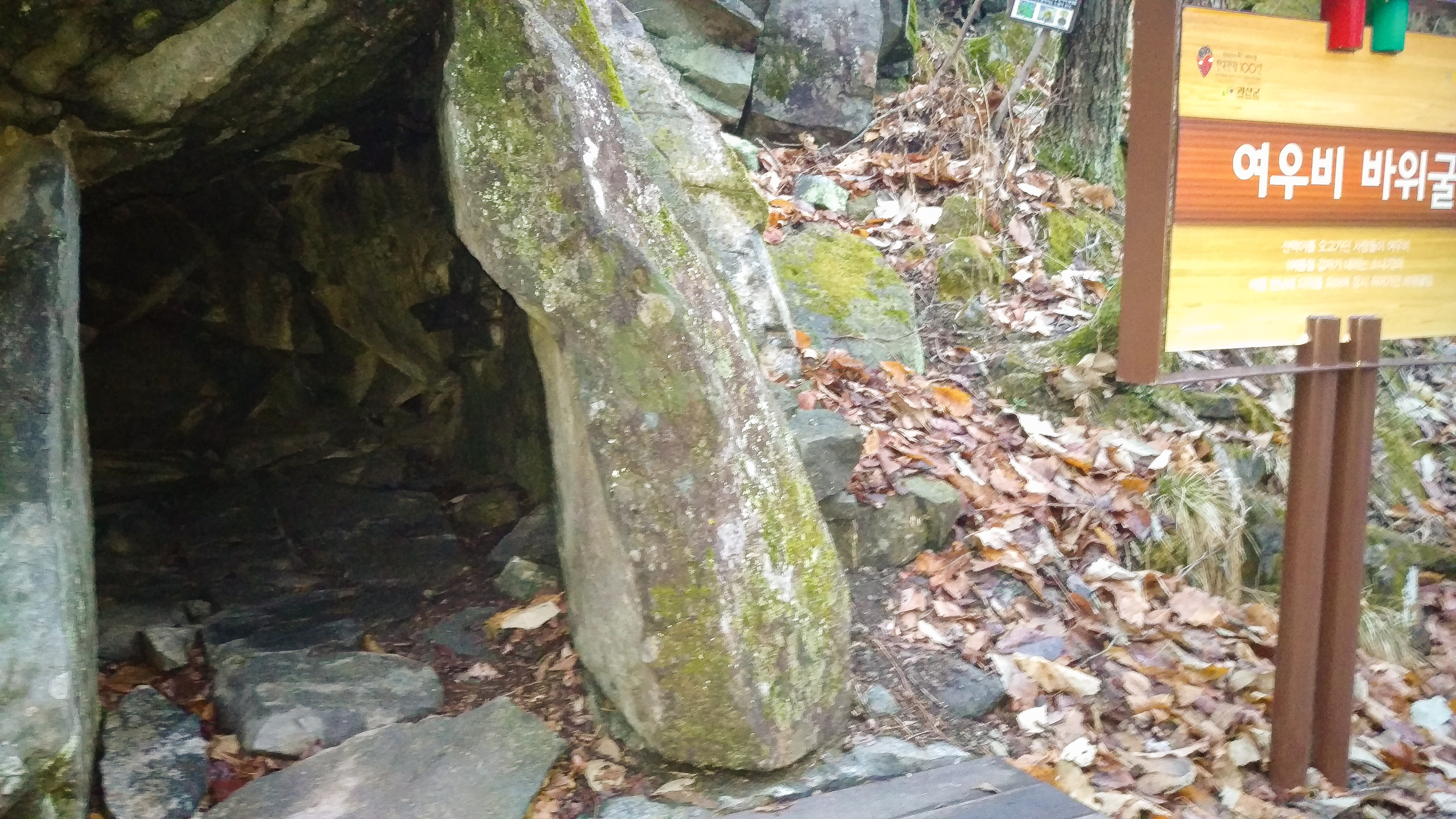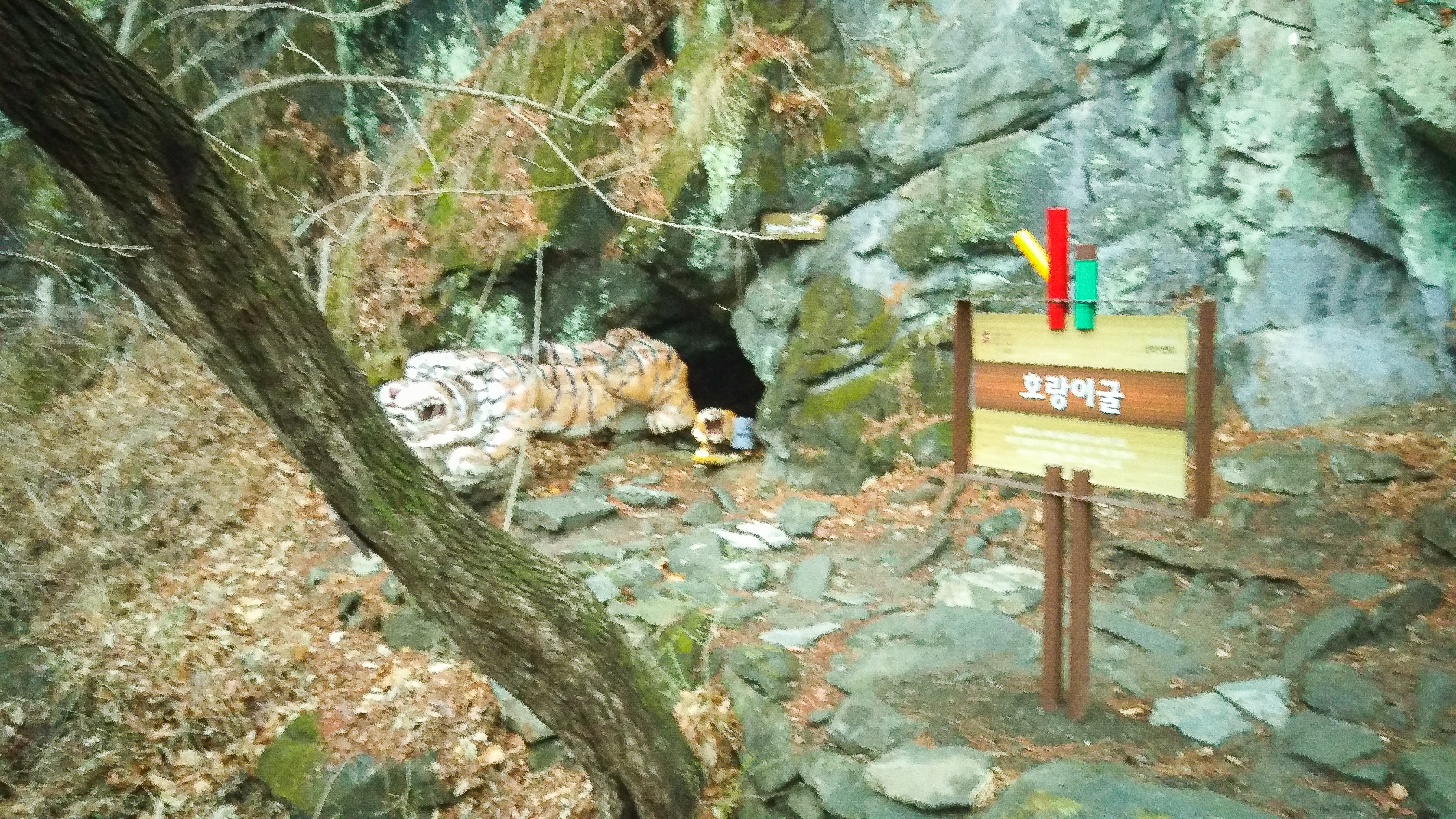 산막이 옛길은 옛 추억과 관련된 재밌는 이름이 붙은 바위나 굴들이 좀 있습니다. 아래는 '호랑이굴', '여우비 바위굴'이라고 하는데, 실제로 옛날에 마을 사람들의 임시 거처가 되거나 산길을 가다 비를 피하는 용도로 쓰던 굴이라고 합니다. 안에까지 깊이 들여다보진 못했지만 밖에서 봤을때는 그리 깊어보이진 않았습니다. 호랑이굴이라고 어미 새끼 호랑이 모형이 있으니 귀엽습니다. ㅎㅎ 여기서 사진 많이 찍으시는 것 같았습니다.