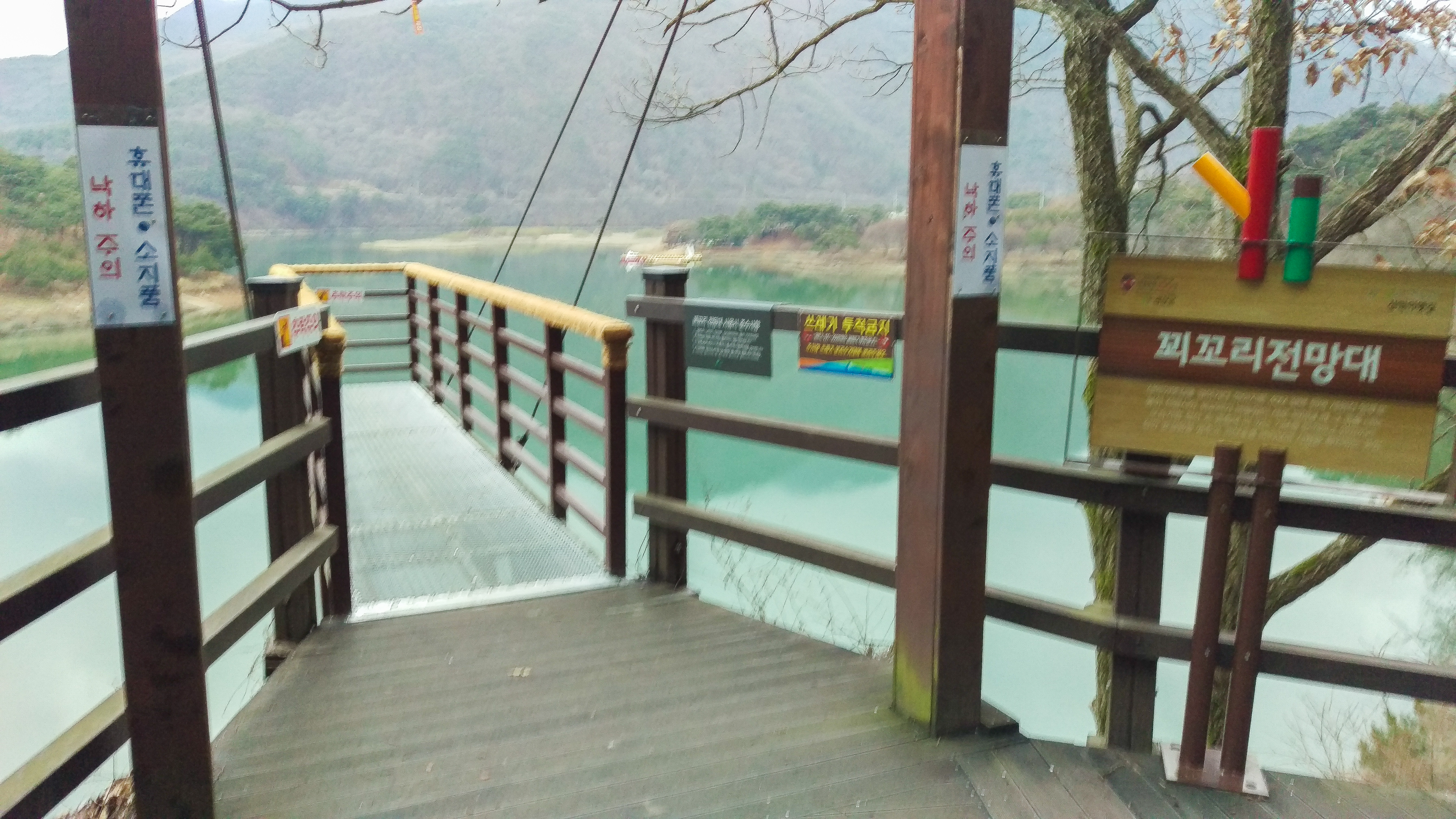 특히, 중간에 만나는 '꾀꼬리 전망대'는 바닥이 철망으로 되어있는 아찔한 데크가 마련되어 있어서 다리가 후들후들 하더라고요 ㅋㅋ 저는 난간을 붙잡고 살며시 다녀왔는데 흔들림도 느껴지고 바닥을 넘어 물이 일렁이는 게 숭숭 나있는 구멍으로 보이니 아찔했습니다. 추억을 남기기 좋은 장소라고 생각되었습니다.