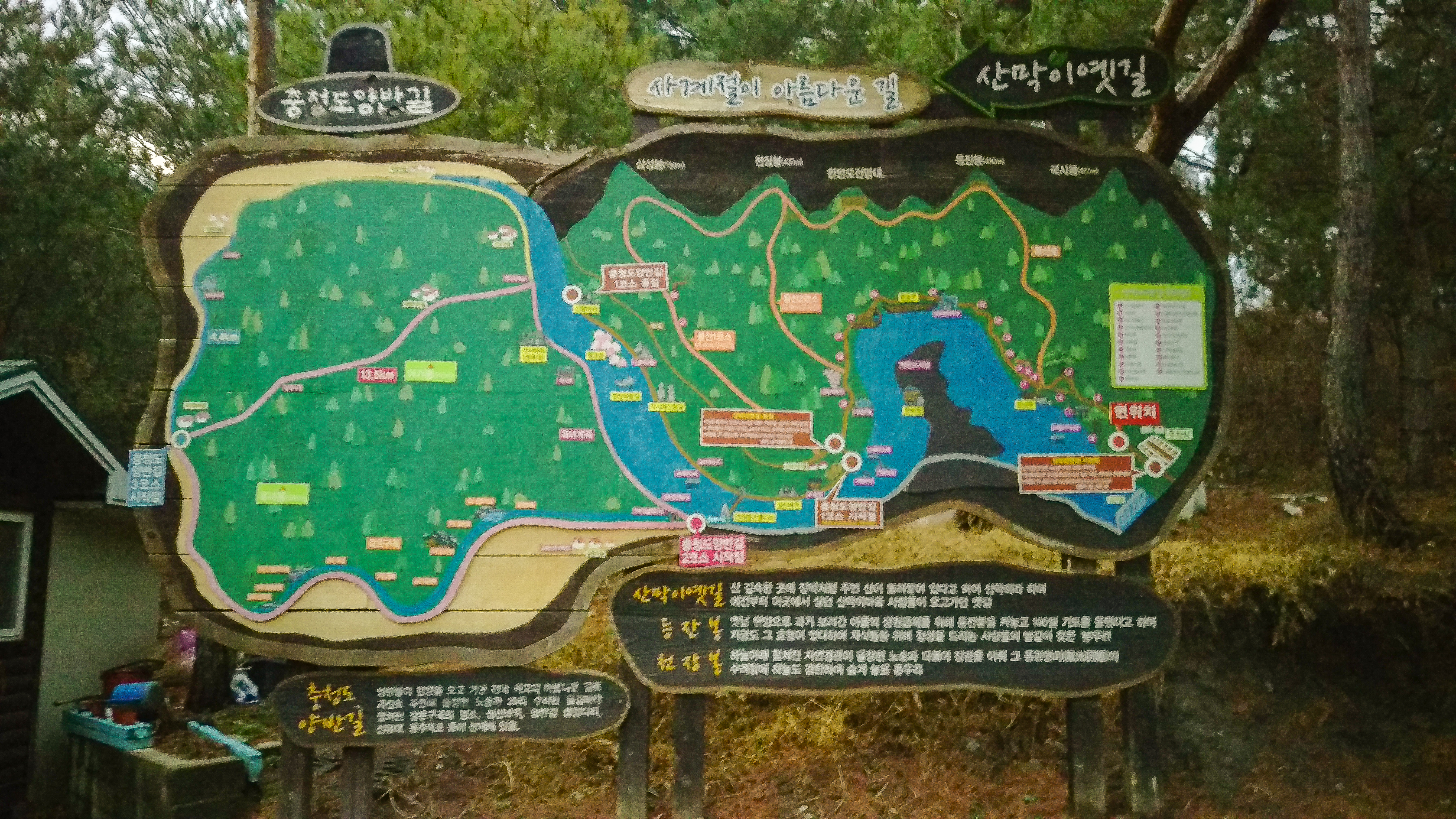 산막이 옛길을 끼고 등진봉, 천장봉을 도는 등산 코스도 있다고 합니다. 가볍게 오시는 분들은 유람선 타고 하이킹 하는 정도로 만족하면 될 듯 하고, 등산을 좋아하시는 분들은 산까지 정복하고 오시면 또 다른 경치를 만날 수 있을 듯 합니다.