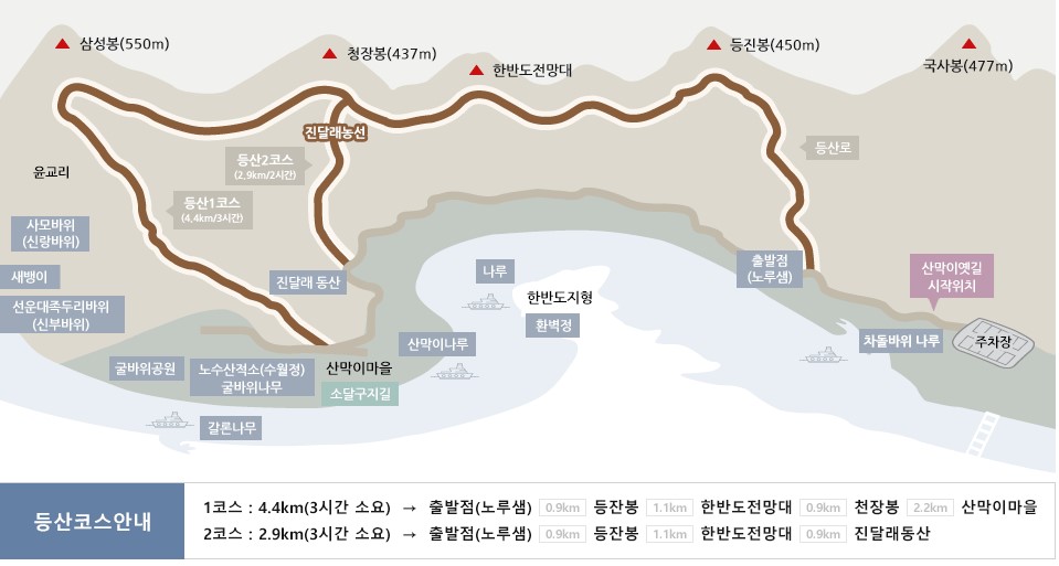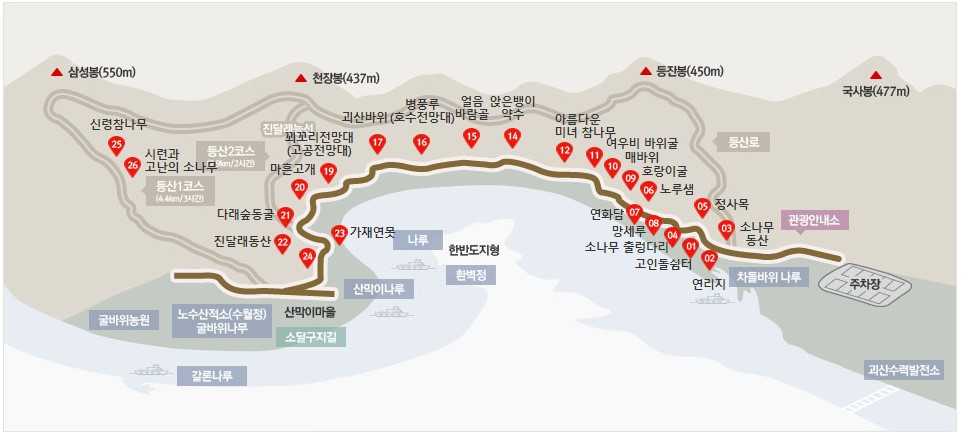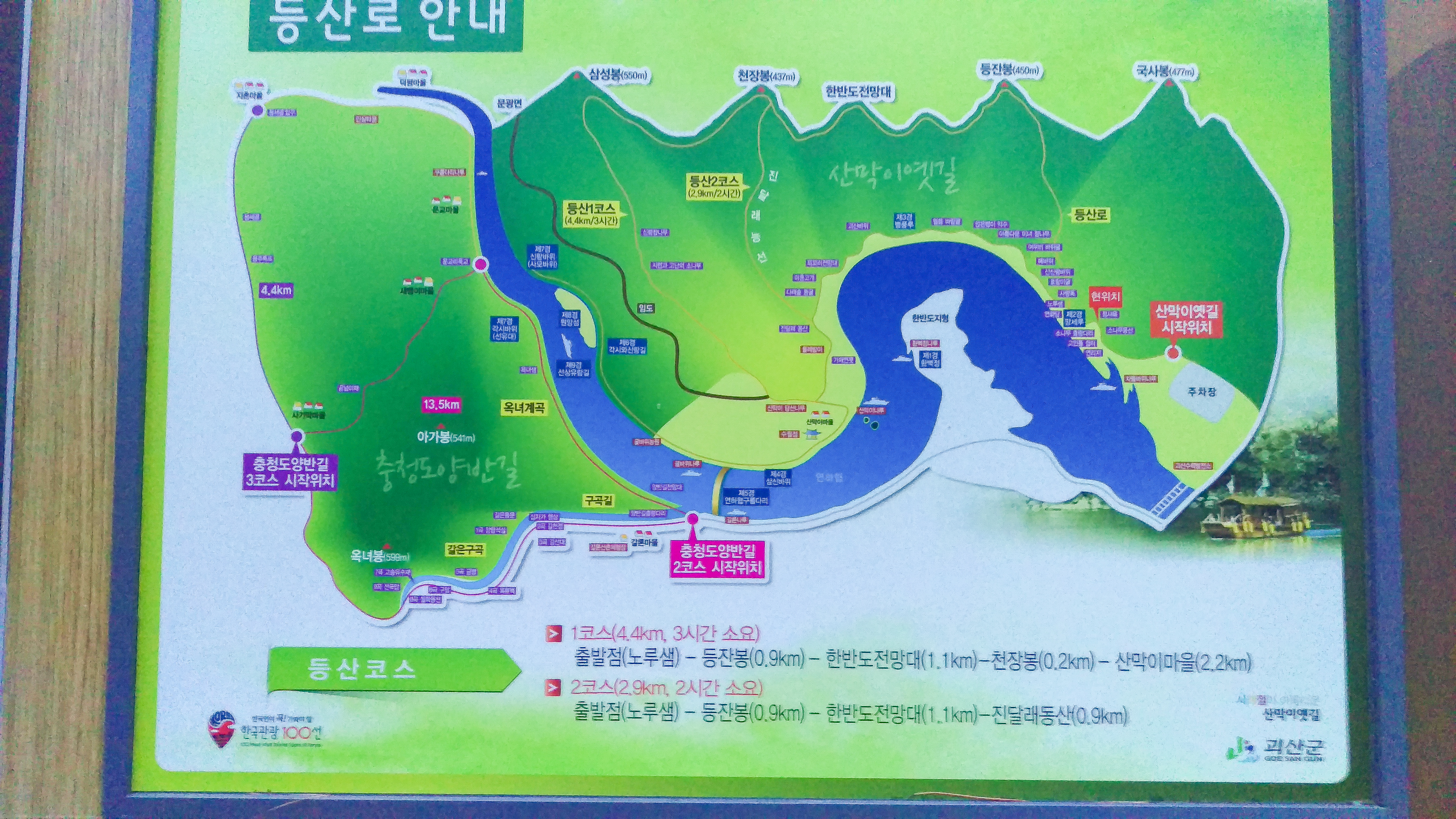 ▼ 괴산군청의 '산막이옛길' 설명 페이지 참고하세요. 지도, 등산로, 명소 소개 등 잘 정리되어 있습니다.