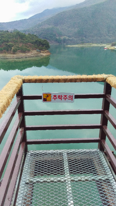 그리고 해가 떨어져서 더 찍지 못했지만, '산막이 옛길'에서 이어지는 '충청도 양반길'을 따라가면 '연하협구름다리'라는 곳이 있습니다. 큰 주차장이 바로 옆에 있어서 드라이브해서 거기까지 가보았는데 해가 떨어져서 사진은 보이지 않아 찍지 못했네요. 잠시 올라가봤는데 이곳도 중간에 구멍이 숭숭 나있는 곳이 있어서 아찔합니다. 줄로 걸어놓은 현수교라서 그런지 여기도 흔들림이 조금씩 느껴지고 상당히 높아서 나름의 스릴이 있네요. ^^ 시간 여유있게 가신다면 구름다리까지 구경하면 좋을 듯 하여 적어둡니다. 특히, 낮 시간에는 유람선을 타고 '산막이 옛길'에서 출발해서 '연하협구름다리'까지 갈 수 있는 듯 합니다. 괴산호에 관광 시스템이 상당히 잘 정비되어 있는 것 같아서 다시 가보고 싶기도 했습니다. 오늘은 혼자 잠시 왔었지만 지인들과 걷기 여행으로 가도 좋을 것 같았습니다.
