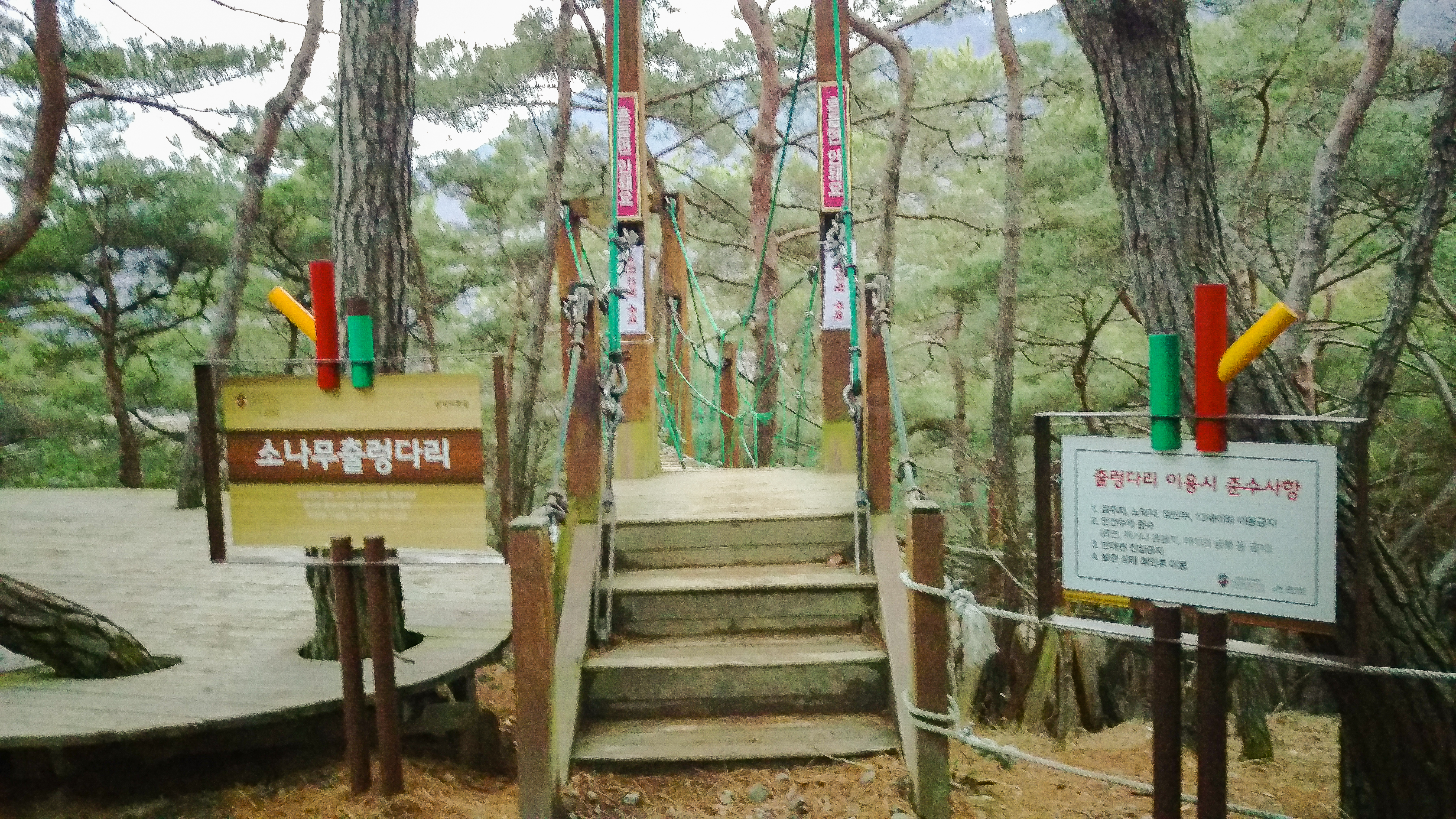 그리고, 재밌는 시설이 하나 있었는데요, 코스 초반에 숲속 놀이터 같은 공간이 있는데 꽤나 정교하게 잘 만들어진 소나무 출렁다리가 있습니다. 진입 방향은 일방통행이라 한 곳으로만 들어가야 합니다. 이게 별 것 아니라고 생각하고 올랐는데 생각보다 출렁거리고, 높이가 괘 높아서 아찔합니다. 12세 이상부터 올라갈 수 있다고 하니 가족단위나 지인들끼리 추억 남기기 좋은 곳이라고 생각되네요. 이게 시원하고 아찔해서 왠지 가장 기억에 남았어요 ㅋㅋ