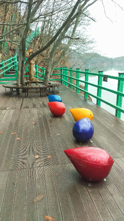 산막이옛길은 데크로 잘 정비되어있고 물을 끼고 가는 경치 좋은 길이지만, 만만하게 봐서는 안 됩니다. ㅎㅎ 옛길을 복원해서인지 정말 산골의 길을 오르락 내리락하며 계속 이어진 계단을 걷다 보면 땀이 절로 나게됩니다. 중간중간 전망대에서 쉬어갈 수 있도록 의자들이 비치되어 있기도 하고, 사진을 찍을만한 곳은 포토존으로 잘 꾸며져 있기도 하니 무리하지 말고 천천히 걸으며 힐링합니다.
