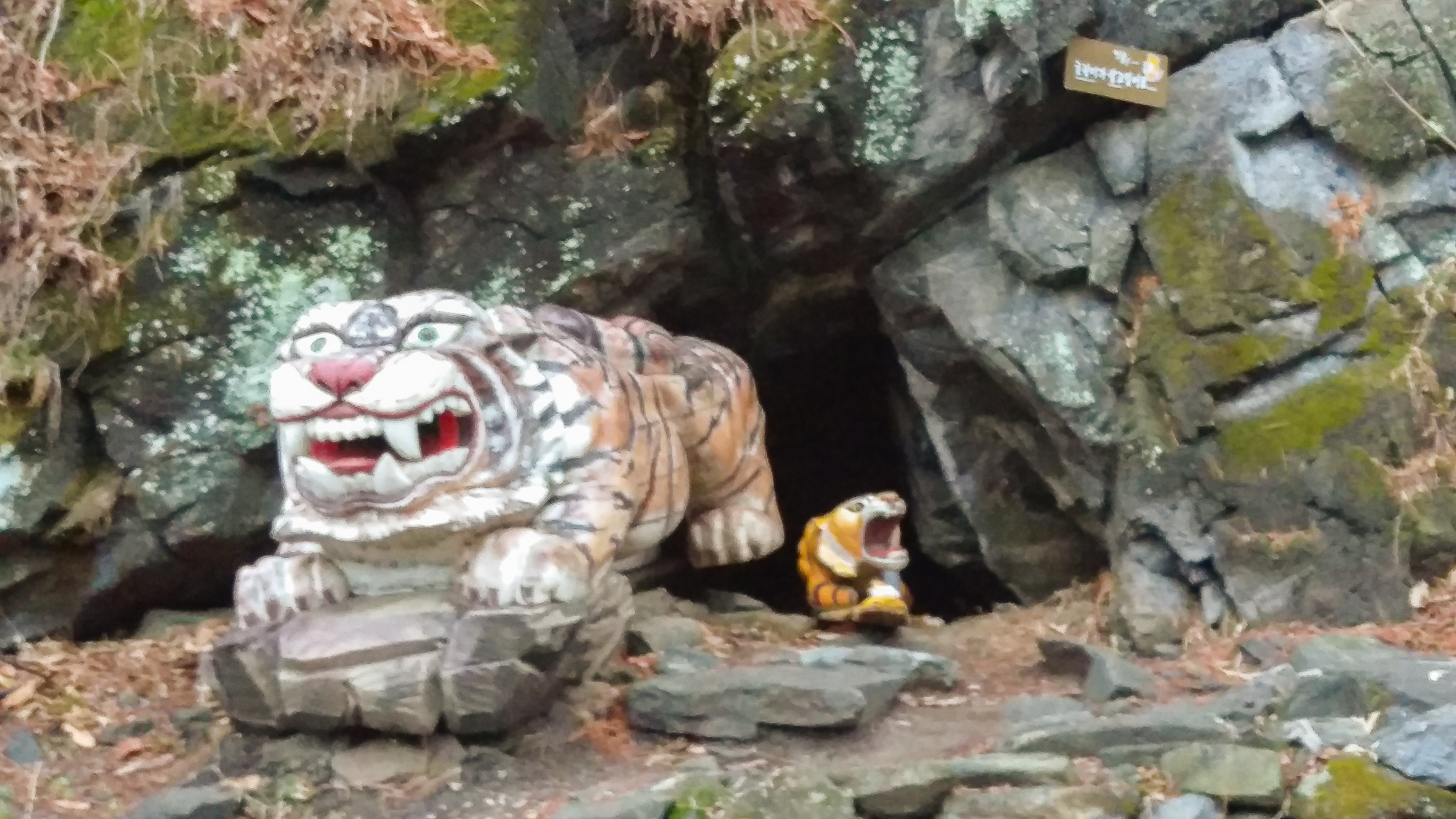 산막이 옛길은 옛 추억과 관련된 재밌는 이름이 붙은 바위나 굴들이 좀 있습니다. 아래는 '호랑이굴', '여우비 바위굴'이라고 하는데, 실제로 옛날에 마을 사람들의 임시 거처가 되거나 산길을 가다 비를 피하는 용도로 쓰던 굴이라고 합니다. 안에까지 깊이 들여다보진 못했지만 밖에서 봤을때는 그리 깊어보이진 않았습니다. 호랑이굴이라고 어미 새끼 호랑이 모형이 있으니 귀엽습니다. ㅎㅎ 여기서 사진 많이 찍으시는 것 같았습니다.