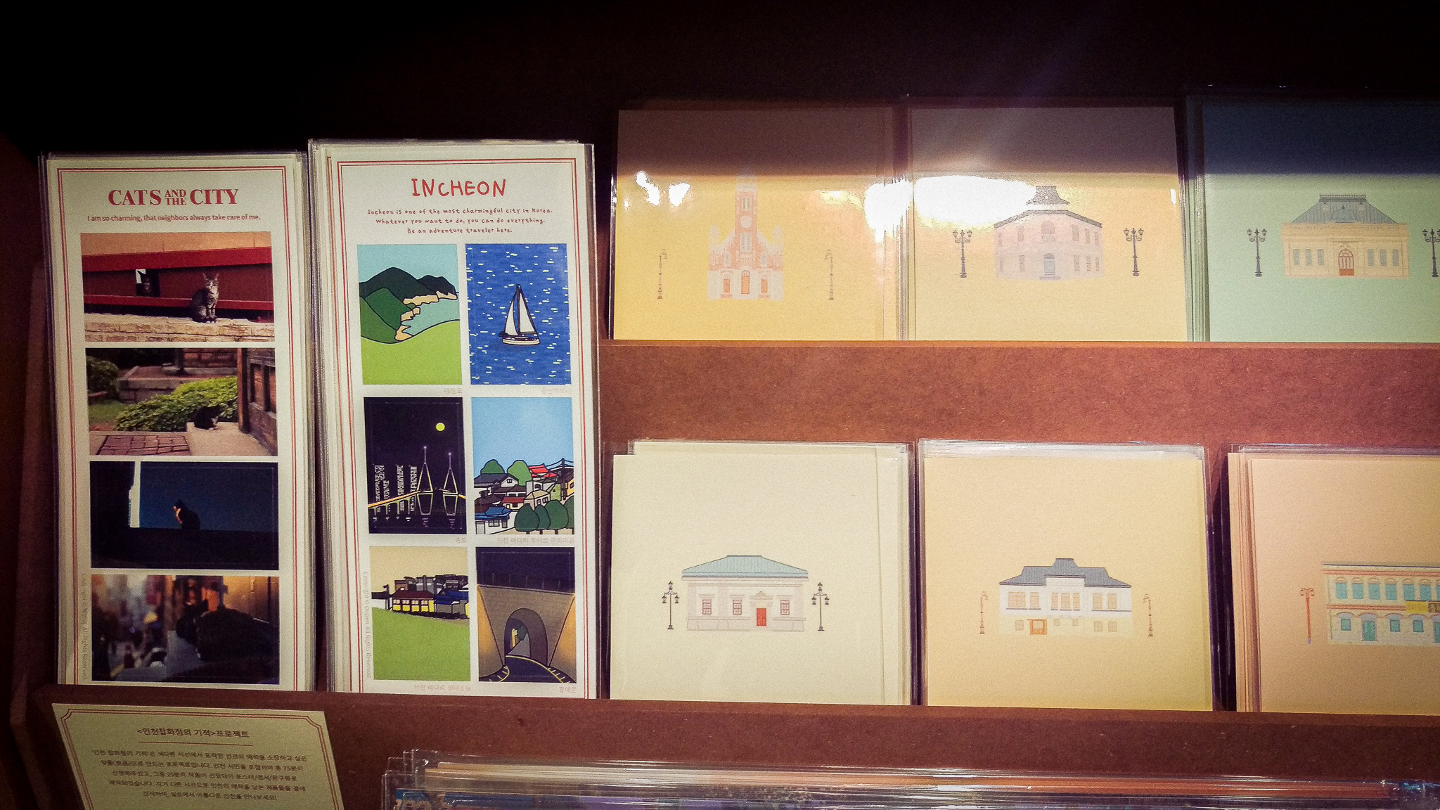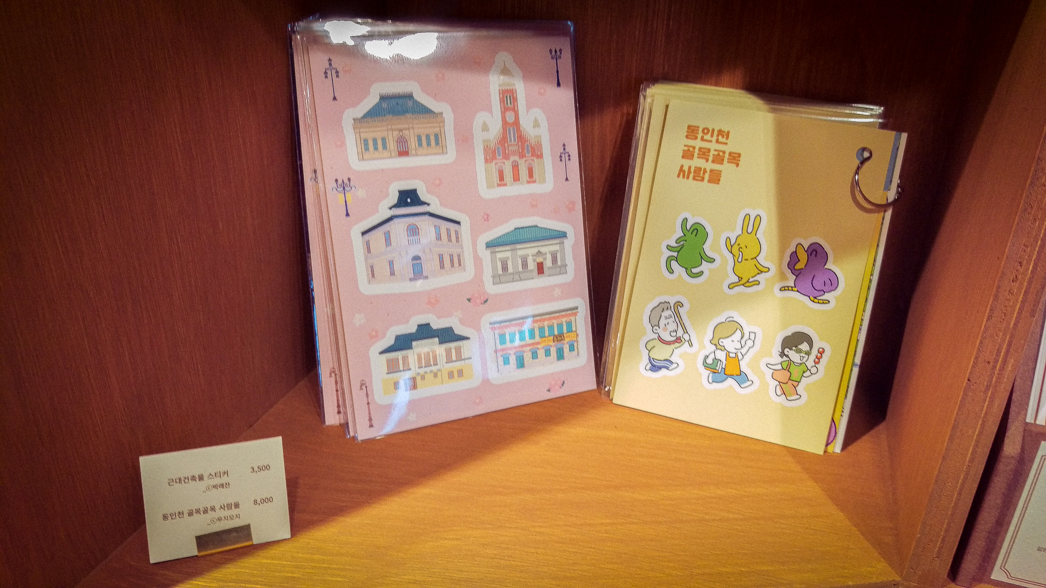 아래 부터는 어떤 상품들을 판매하는지 매대를 대략 담아봤습니다. 가벼운 문구류 등은 예쁜 것들을 골라 판매중이신 것 같고, 뒤편으로 인천을 테마로 한 상품들이 있습니다. 이런 지역 명소를 놀러왔을 때 어떤 기억에 남는 기념품 같은 걸 사기는 어려운 일인데, 이곳이 잘 알려진다면 신포동이나 인천 구경오신 분들을 위해 좋은 기억으로 간직할 수 있는 선물이 될 수 있겠다는 생각이 들었습니다.