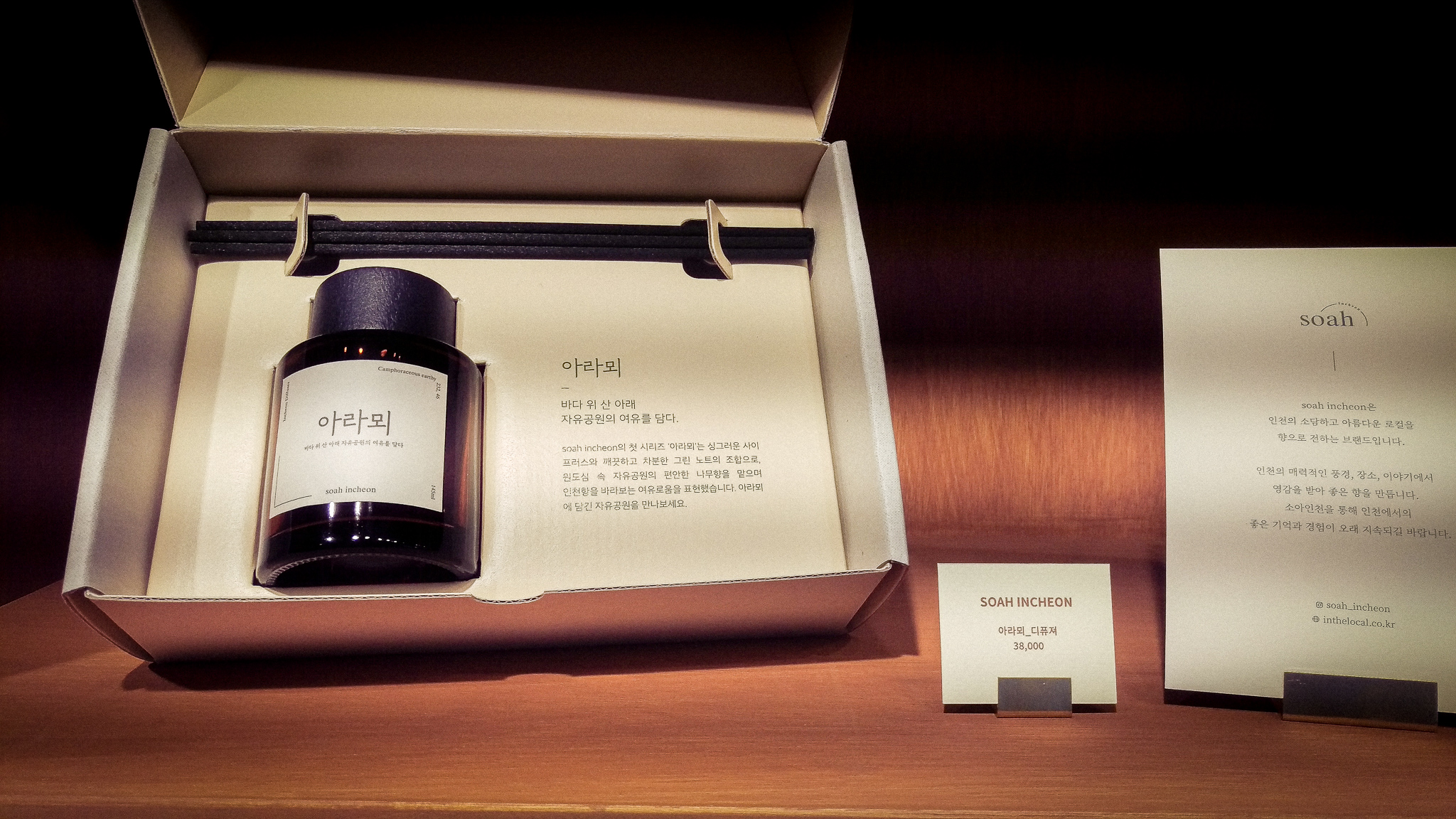개인적으로 인천 자유공원을 테마로 만들었다는 디퓨저 아라뫼가 특이했습니다. 로컬 특성을 반영한 상품 중에 '향기'를 담는다는 생각은 못 해봤던 것 같은데요, 굉장히 멋진 발상이었고 패키지도 멋스러웠습니다.