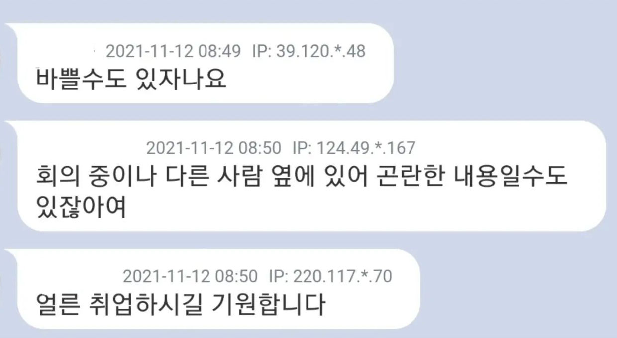 좀 과격하게 남기신 분들도 있긴 하지만, 전체적으로 다 배려의 차원에서 전화 통화 괜찮으시냐고 묻는 것 같다. 가끔 핸드폰이나 보험 판매 전화가 오면 혹시나 전화를 끊을까봐 내 얘기는 듣지 않고 속사포로 다다다다 이야기를 하시는 경우가 있다. 감사하지만 필요가 없을 것 같다고 얘길 하고 끊는 편이지만 마음이 편치 않은 건 사실...