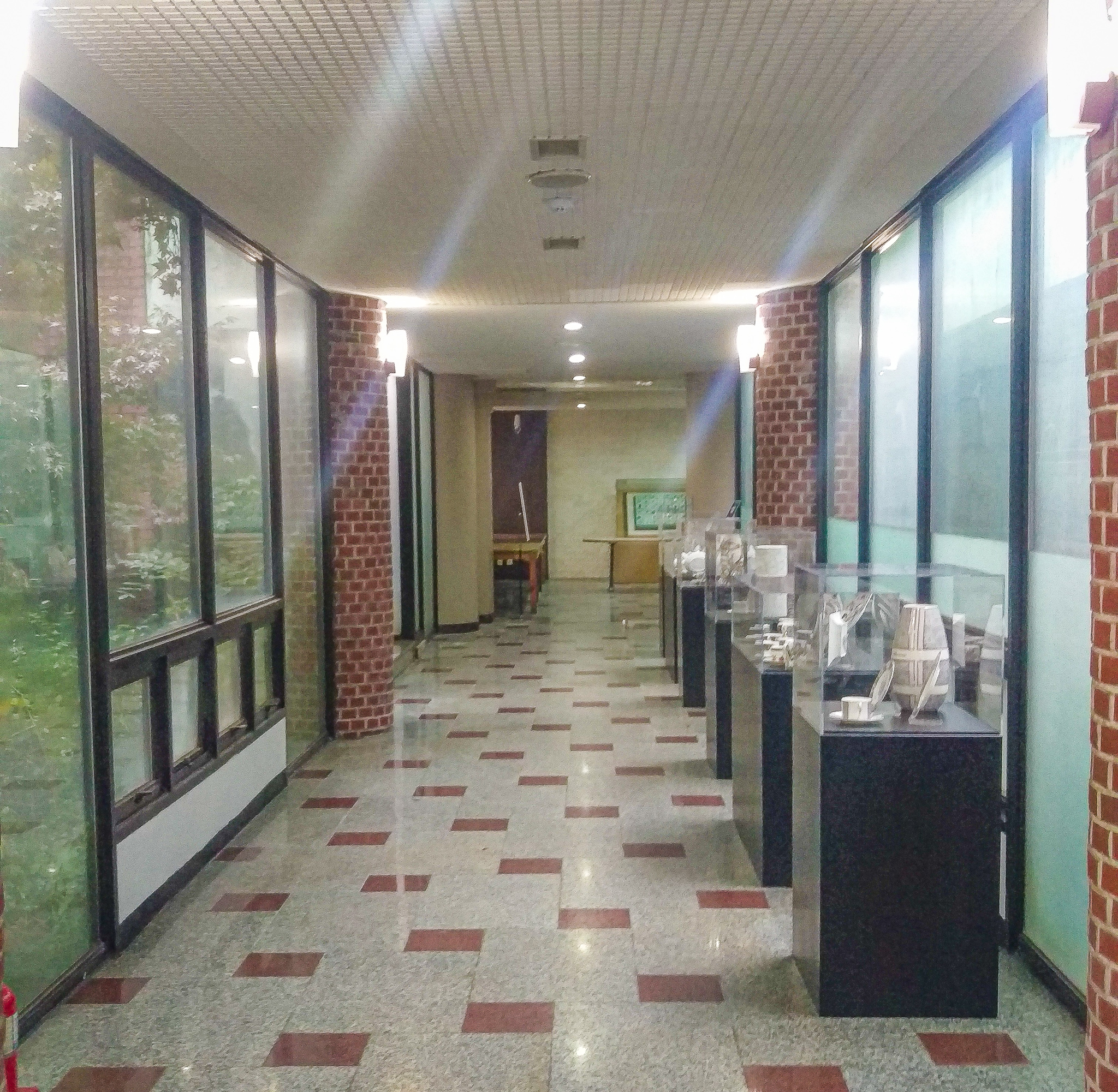 아무튼 복도는 이런 느낌입니다. 길 따라서 가다보면 이정표에 온천 위치가 표시되어있어요. 온천은 끝에서 2층으로 올라가면 나옵니다. 엘리베이터도 있고 계단도 있어요. 복도에는 전시된 도자기 작품들이 있는데 요건 아래에 적어볼게요.