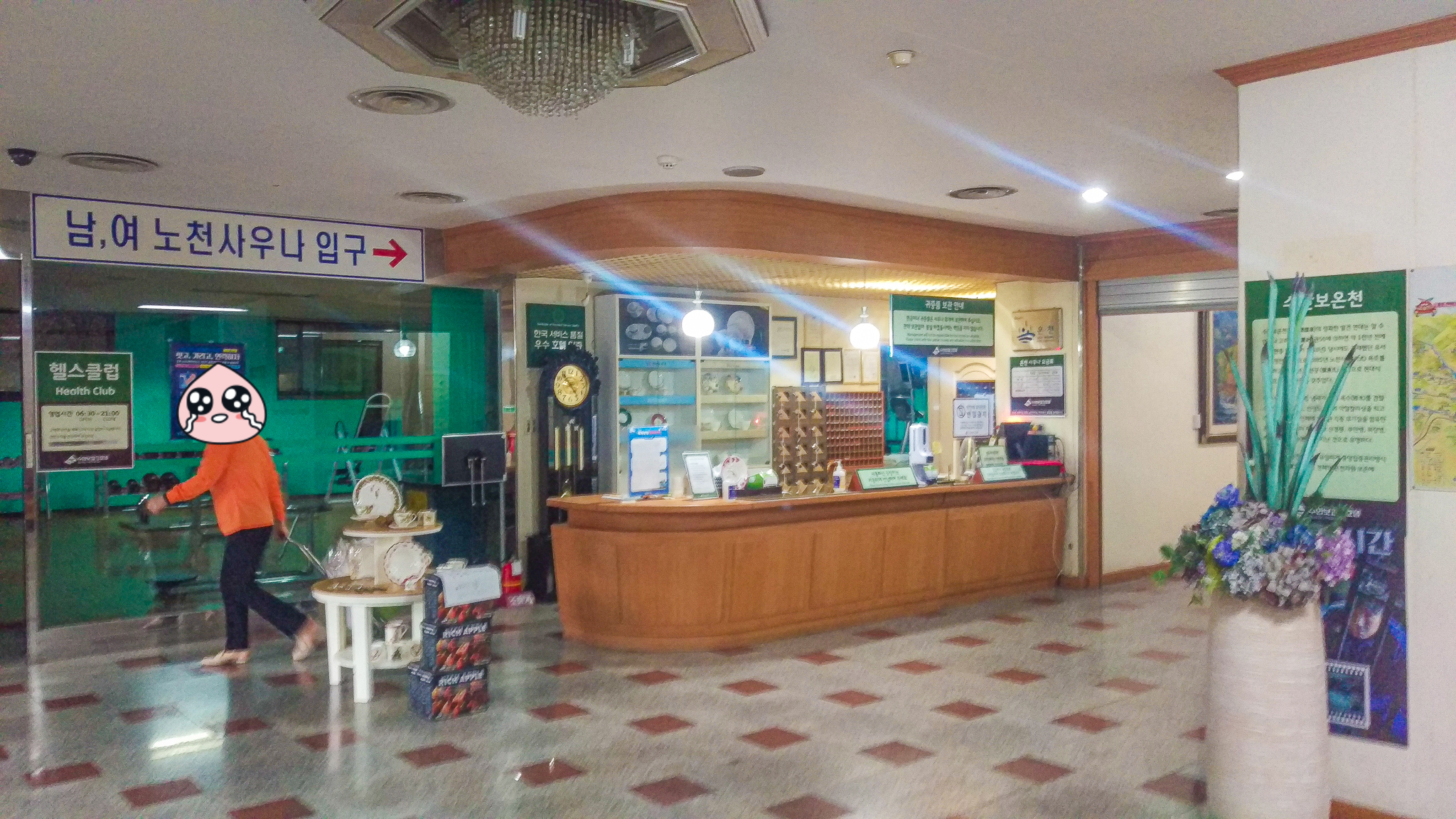 예전엔 모르고 메인 로비로 가서 노천탕으로 걸어갔는데, 밖에서 더 오른쪽으로 가면 작은 유리문이 하나 더 있어서 거기로 들어가면 됩니다. 메인 로비에 가면 도자기로 된 작품들을 볼 수 있는데 카운터의 직원분이 인사해주심 ㅎㅎ