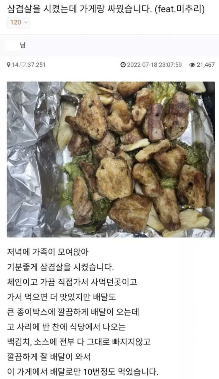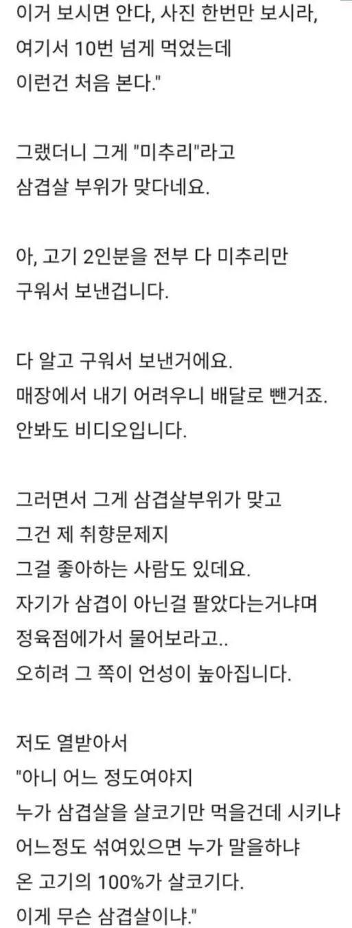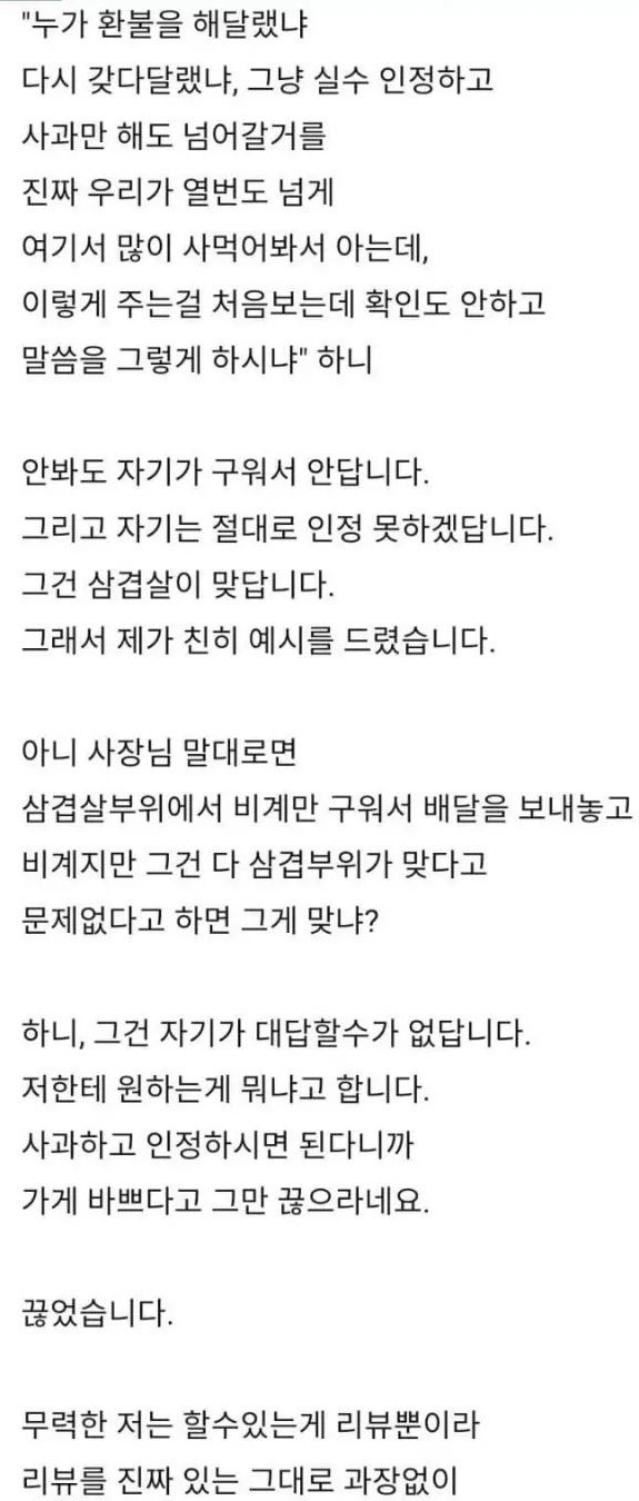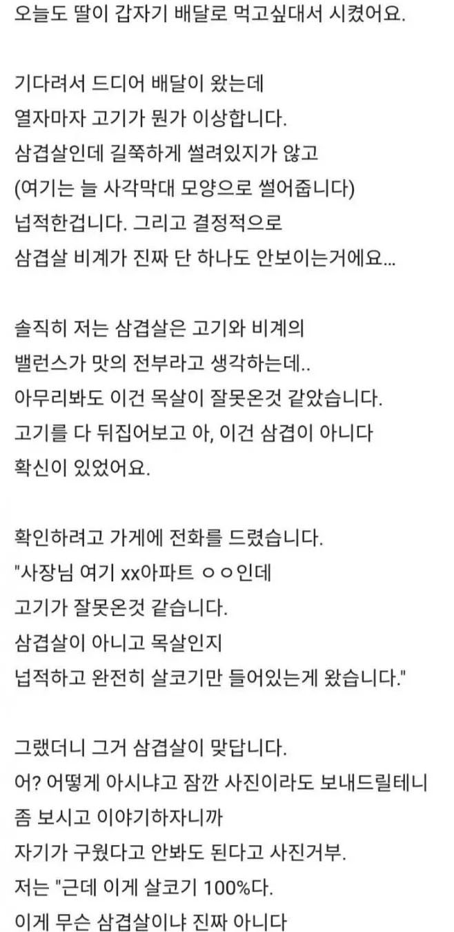 자동차 수리할 때도 그렇죠, 돈을 좀 더 주더라도 속이지 않고 속속들이 설명해주는 그런 정비점을 가게 되더라고요... 아무튼 제 개인적인 이런저런 경험들이 자꾸 생각나는 사건이라서 한 번 포스팅 해봤습니다. 열 번이나 시켜먹은 삼겹살 집이면 정말 맛있게 드셔오셨단 얘길텐데... 그런 집에 평소와 다른 제품을 보내는 건 좀 아니다 싶긴 하네요... 차라리 상황을 허심탄회하게 얘기해주셨더라면 원만하게 해결될 수도 있지 않았을까 싶기도 하네요... 어려운 일입니다 참...