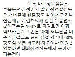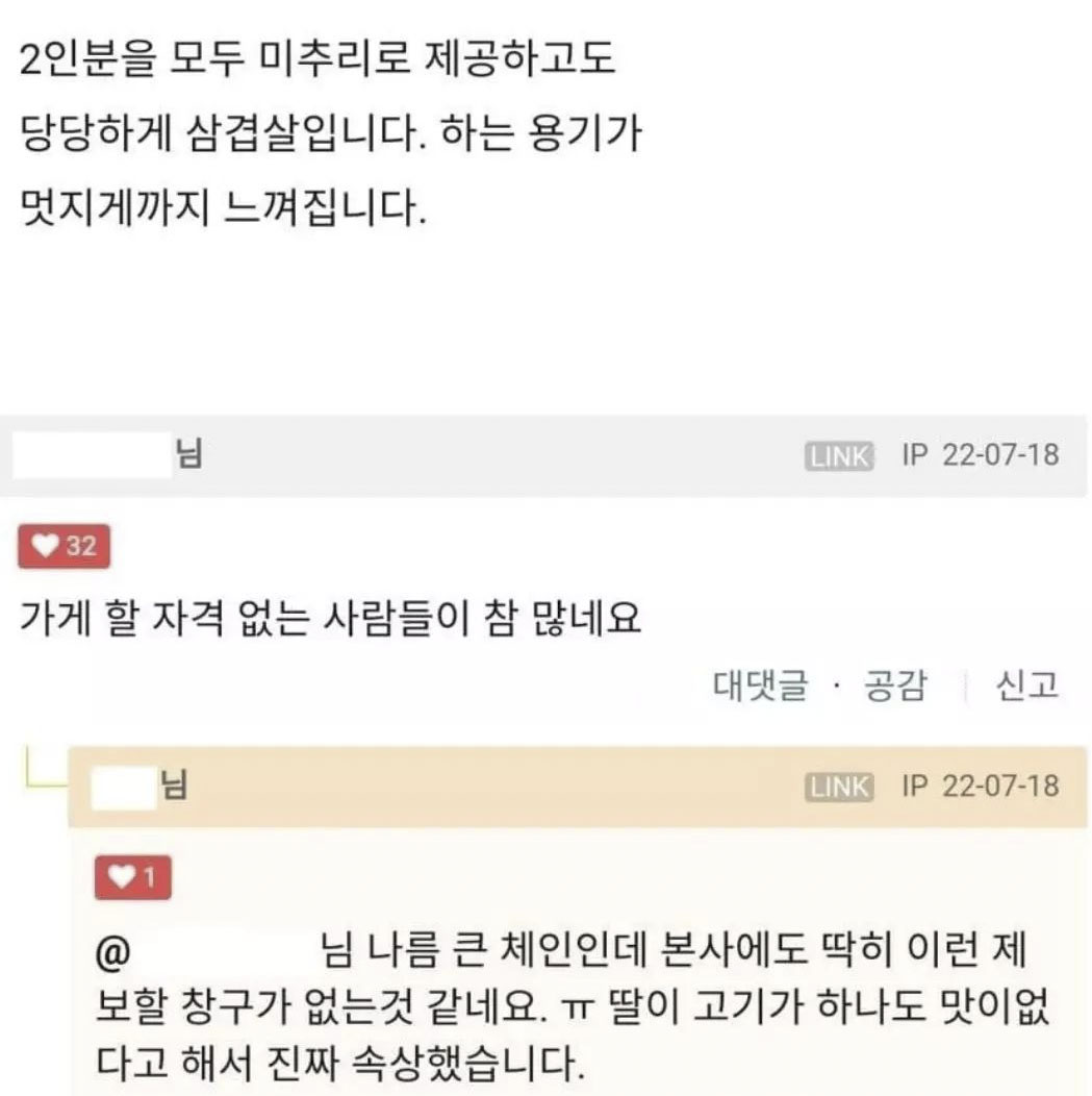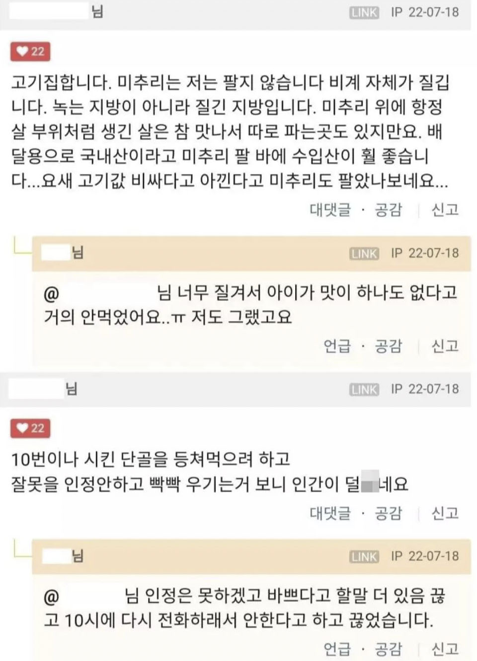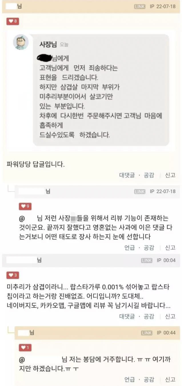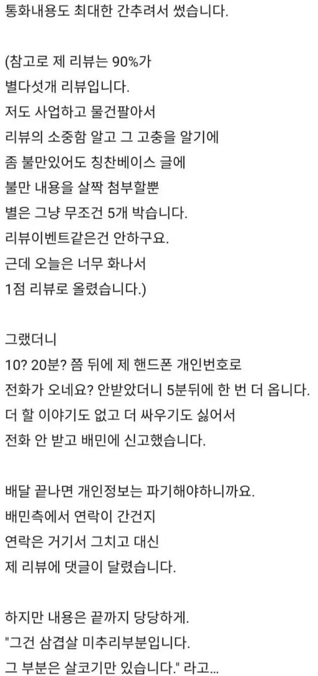 자동차 수리할 때도 그렇죠, 돈을 좀 더 주더라도 속이지 않고 속속들이 설명해주는 그런 정비점을 가게 되더라고요... 아무튼 제 개인적인 이런저런 경험들이 자꾸 생각나는 사건이라서 한 번 포스팅 해봤습니다. 열 번이나 시켜먹은 삼겹살 집이면 정말 맛있게 드셔오셨단 얘길텐데... 그런 집에 평소와 다른 제품을 보내는 건 좀 아니다 싶긴 하네요... 차라리 상황을 허심탄회하게 얘기해주셨더라면 원만하게 해결될 수도 있지 않았을까 싶기도 하네요... 어려운 일입니다 참...
