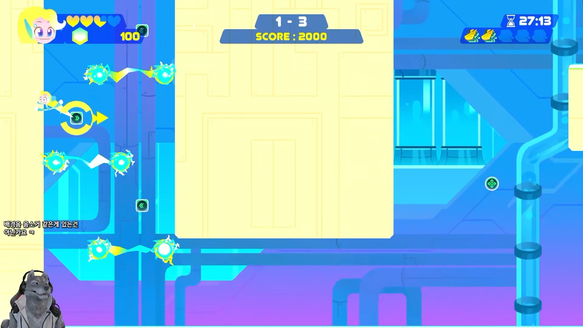 스테이지 별로 스토리가 중간중간 등장하며, 한국어 더빙이 고퀄로 되어있다. 구글링 해보니 제작사 이름에 한국풍 이름의 제작사(나날이스튜디오, 이키나게임즈)가 있는 것으로 보아 한국팀이 만들면서 더빙까지 신경써주신 것 같습니다. 오랜만에 발견한 귀엽고 퀄리티 괜찮은 게임이라 관심 있으신 분들에게 도움이 되었으면 하는 마음으로 포스팅 해봅니다. 자극적이지 않은 게임 스토리와 귀여운 그래픽과 음성 등으로 전체 연령 모두에게 추천할 만 한 게임입니다. 직진형 액션 플랫포머 게임 좋아하시는 분들께 추천드립니다.