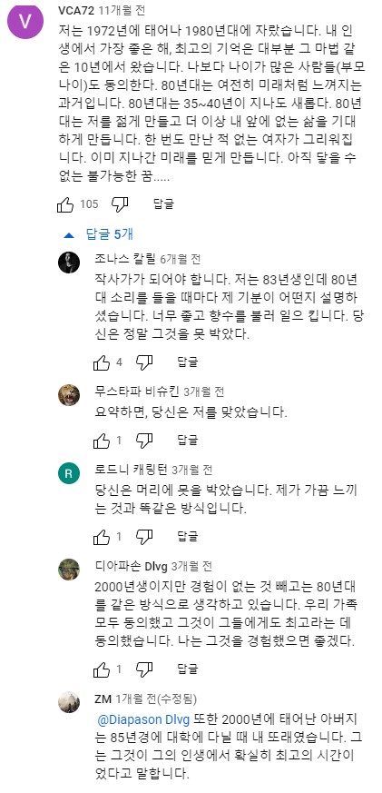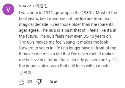 저는 사실 80년대의 기억이 별로 없지만, 나이를 먹어가고 이런 저런 문화콘텐츠를 접하면서 80년대에 대한 향수를 그리워하는 사람들이 많다는 느낌을 받곤 했습니다. 80년대의 콘텐츠들이 올 수 없을 것 같은 미래의 느낌이지만 또 과거에 생각해낸 미래적인 느낌이라 향수가 느껴지기도 하고, 뭔가 묘한 느낌을 주는 것 같아요. 당시에 쿨하고 멋진것들을 만들고 유행이 되었겠지만 시간이 지난 지금은 그것이 묵혀져서 또다른 향수와 섞인 느낌? 저 역시도 언젠가 그런 80년대를 직접 살아보고 싶다는 강렬한 느낌을 받기도 했었어요. 넷플릭스의 '기묘한 이야기'를 비롯해서, 게임 '사이버펑크2077' 등, 요즘에도 레트로풍 디자인, 음악 등을 떠올리면 80년대 느낌을 많이 살리고 있지 않나 하는 생각을 합니다. 저는 90년대 말의 베이퍼웨이브 라든가, 고전적인 스윙의 재해석인 일렉트로스윙 같은 것들도 좋아하고 여러가지 꽂히면 다 좋아하는 편인데 요즘엔 특히 80년대 콘텐츠들이 제 눈과 귀를 사로잡고 있는 것 같습니다. 함께 읽어서 인상깊었던 다른 댓글들도 좀 더 갈무리 해보았습니다. 다들 이 노래 들으면서 갬성 터진듯 ㅋㅋ