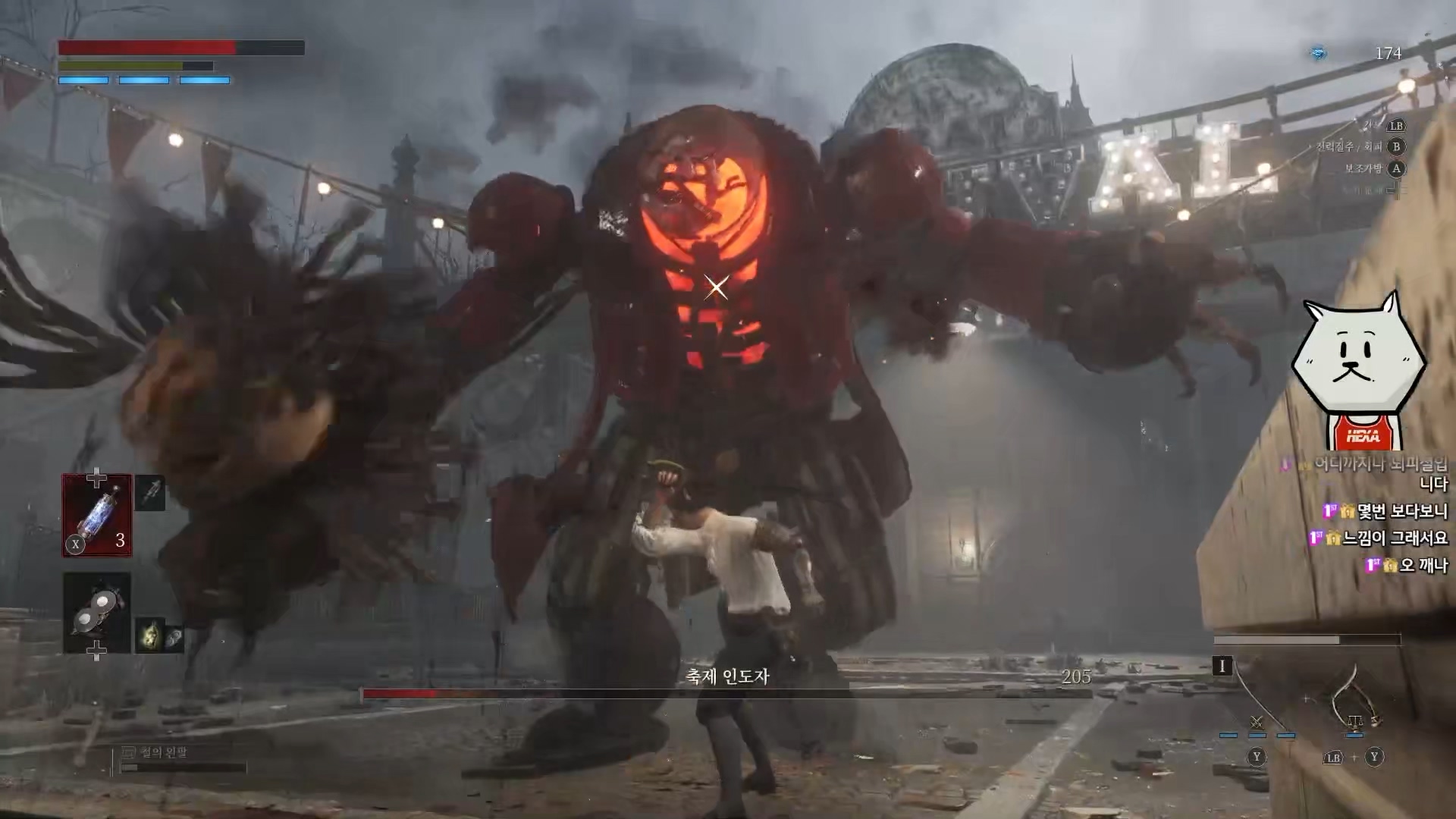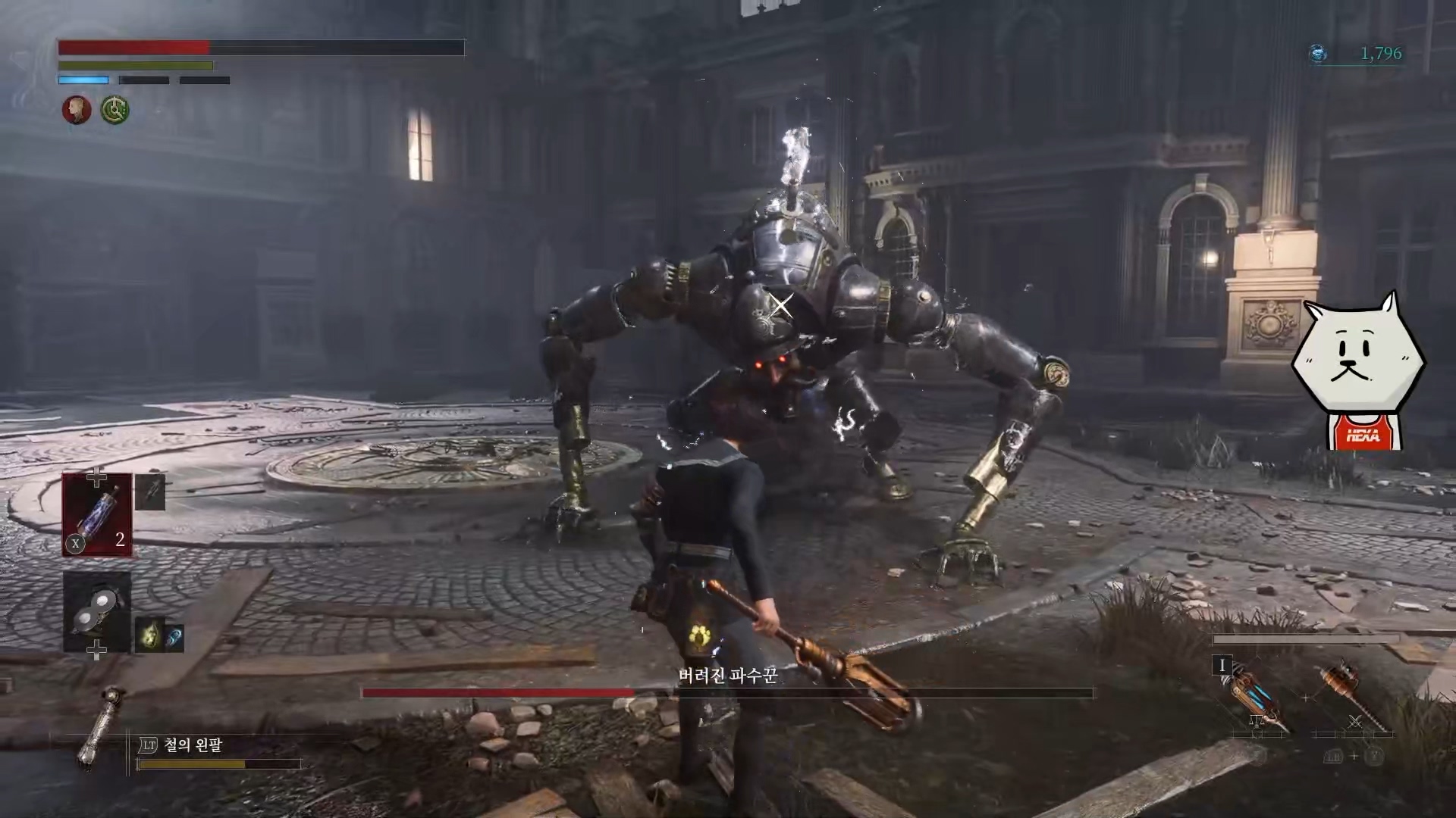 데모버전 마지막 보스로 '버려진 파수꾼'이 등장합니다. 기계류라서 그런지 둔기 데미지가 잘 먹혔고, 전기를 사용하는 사자 원숭이(세키로) 같은 느낌이었습니다. 전기를 뿜는 모션은 야수 파알(블러드본)의 느낌도 났습니다. 퍼펙트 가드와 장판 피하기를 잘 못 하면 고전하게 되는 보스였고, 여러번 부딪히면서 패턴을 익히면 쉽게 잡을 수 있습니다.