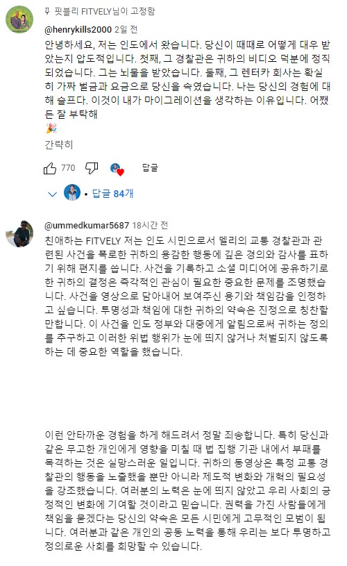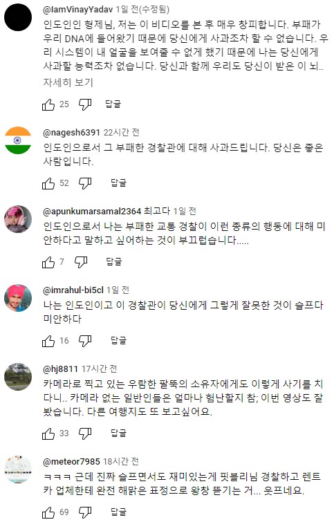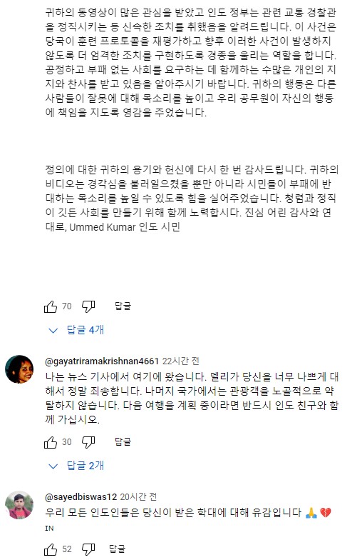 그리고 유튜브 댓글에 외국 댓글이 엄청 많이 달렸는데, 인도 분들이 오셔서 다들 미안하다고 창피하다고 위로의 댓글을 구구절절ㅎ 많이 다셨더라고요 웃프네요.... 아래는 몇개 번역기 돌려봤어요.