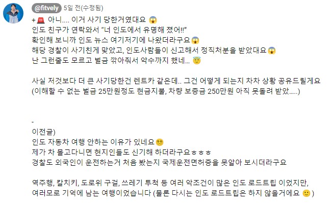 일단 아래 화제의 핏블리 인도 여행(트래블리) 영상을 링크로 남겨두니 못 보신 분들은 한 번 보세요. 개인적으로 해외 로드트립 멋지다고 생각하는데 대리만족 되는 재밌는 여행 영상이었네요. 아무튼 렌트카로 로드트립 하고 경찰이 단속을 하고 벌금이라면서 내라고 했는데, 외국 여행갔는데 대화도 잘 안 통하고 안 줄 수도 없고... 깎아줬다고 악수까지 했다는데 현지에서 이슈되고 해당 경찰은 사기로 정직됐다고 합니다. 그와중에 렌터카 업체에 보증금으로 맡긴 돈은 아직 못 받으셨다고... ㄷㄷㄷ