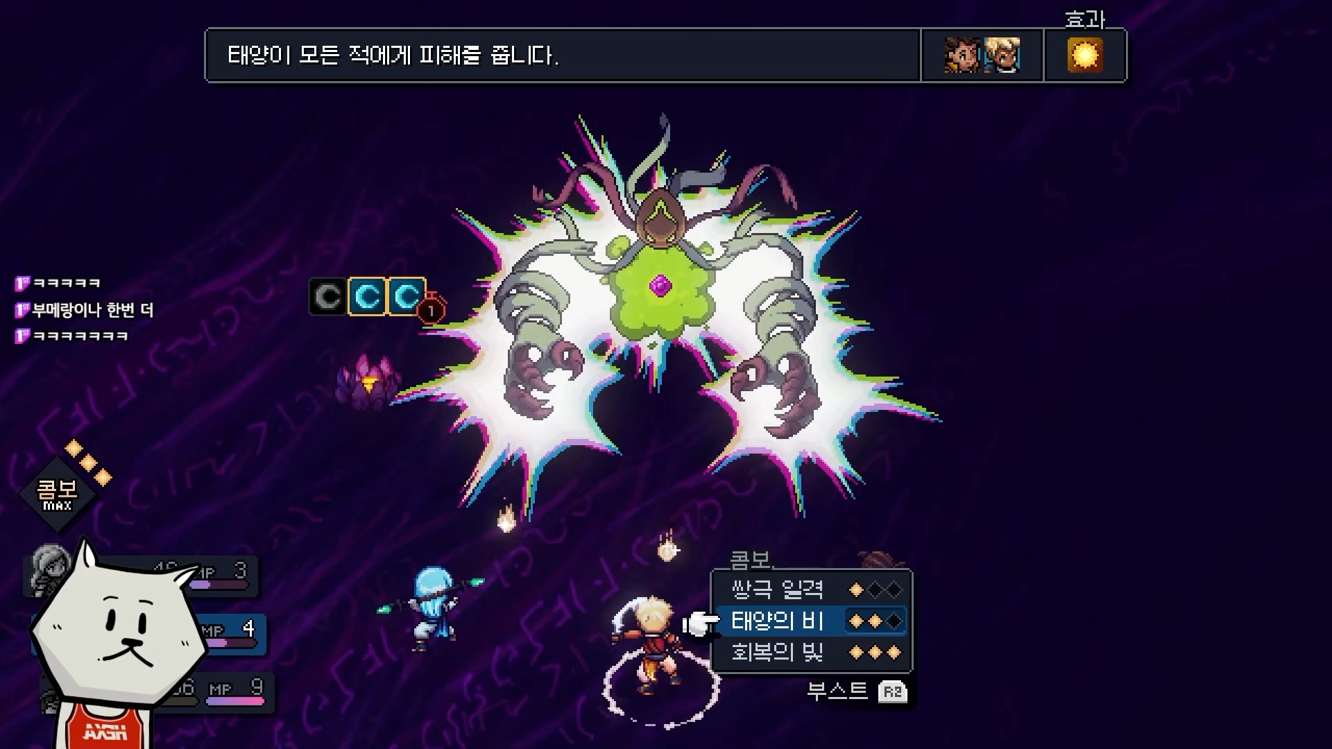 개인적으로 어렸을 때 엔딩을 못 봐서 언젠가 해야지 하고 있는 명작 '크로노 트리거'와 비슷한 느낌을 받았는데, 2인기 콤보 공격이나 맵에서의 액티브한 전투 진입, 수려한 도트 그래픽과 월드맵 표현 등이 옛날 향수를 불러일으키고 있습니다. 음악에 크로노 트리거 제작진 분께서 참여했다고 하고, 게임 설명 페이지에서도 레트로 게임에서 영감받았다고 하는데 고전 슈퍼 패미콤 전성기의 RPG를 쏙 빼닮아 있습니다. 거기에 더해 더욱 업그레이드 된 빛의 효과와 도트 모션 등이 눈을 즐겁게 합니다.