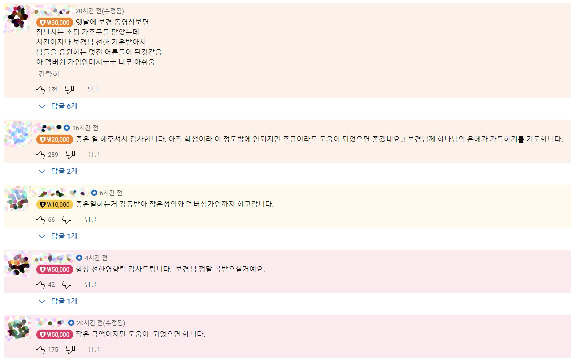 저는 원래 구독자도 아니고 잘 모르는 채널이었는데 알고리즘에 떠서 보게되었네요. 영상을 보면서도 놀랐는데 특히, 댓글이 놀라웠습니다. 좋은 일에 쓰라고 힘 보태준다며 크고 작은 후원 댓글들이 엄청 많이 달렸더라고요, 외국에서 달러로 후원을 하시는 분들도 계시고 액수에 상관없이 마음을 써주시는 팬분들이 계셔서 정말 멋진 일을 하셨구나 하는 생각이 들었습니다.