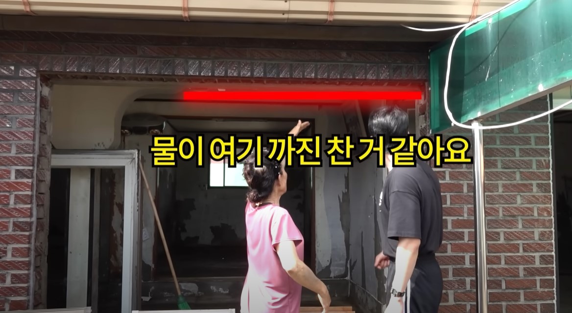 집에 벽지를 보면 거의 끝까지 물이 차있습니다. 어른 키가 다 잠길만큼 큰 피해였는데, 근처 제방 둑이 무너지면서 일이 커졌고, 이장님이 긴급하게 주민들을 대피시키고 연락해서 다행히 주민 분들은 대피를 잘 하신 모양이었습니다. 그런데 물에 잠기면 집안 물건은 다 고장나고 썩기 때문에 다 버리고 계시더라고요...